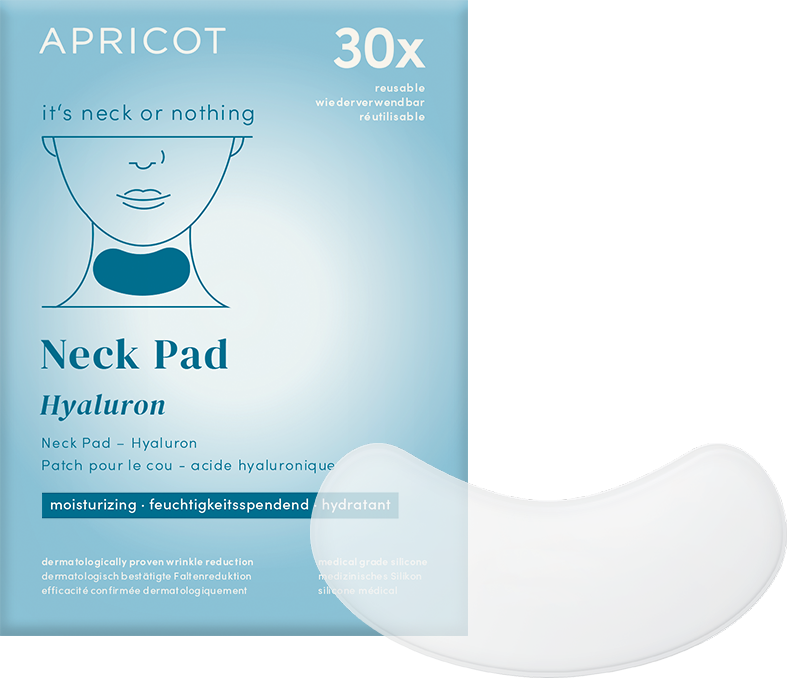 Този анти-ейджинг шийно пач от медицински силикон на APRICOT осигурява на кожата на шията ви дълготрайна хидратация. Нискомолекулярната хиалуронова киселина прониква дълбоко в кожата и я подхранва интензивно. Падовете могат да бъдат използвани до 30 пъти.