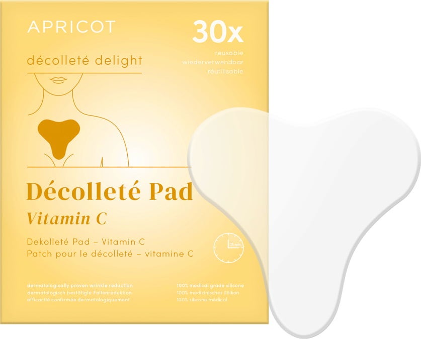 С пача за деколте с витамин C от APRICOT можете интензивно да се погрижите за хиперпигментирана или слънчево увредена кожа в областта на деколтето. Този продукт е изработен от медицински силикон и е обогатен с антиоксидантен витамин C, което може да спомогне за изглаждане на линии и бръчки. Може да се използва до 30 пъти.