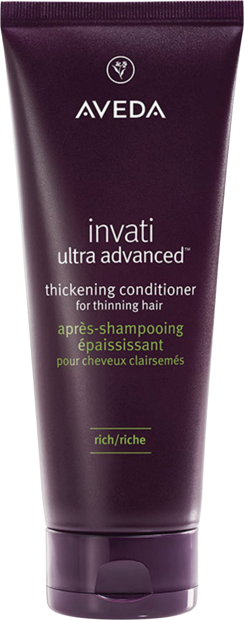 Invati Ultra Advanced Thickening Conditioner Rich от Aveda е подхранващ балсам на растителна основа, който придава обем на нормална и тънка коса, правейки я да изглежда по-плътна. Приятно ухаещият балсам също така намалява и накъсването на косъма. Ароматът с лавандула, градински чай, австралийско сандалово дърво, ванилия и други чисти растителни и флорални есенции въздейства вдъхновяващо на сетивата.
