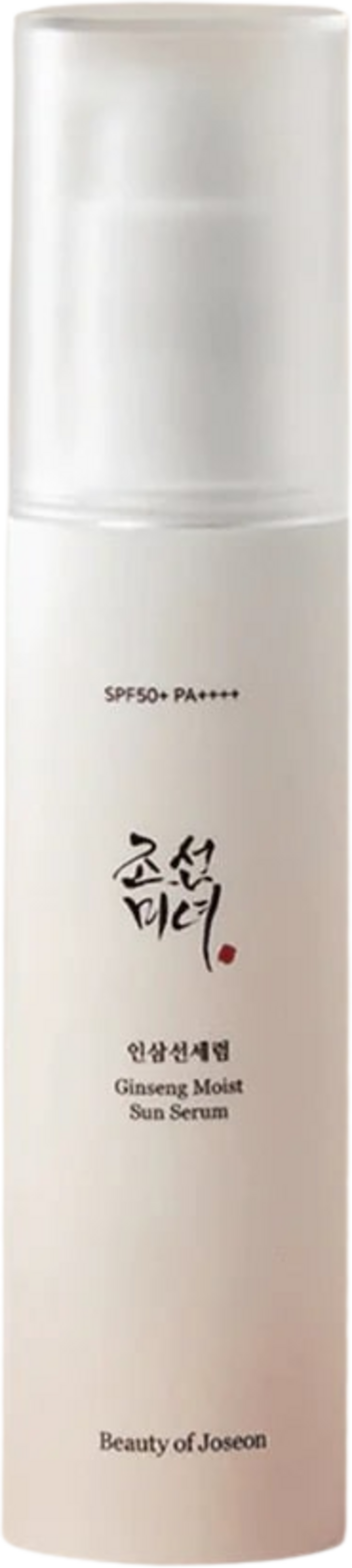 Ginseng Moist Sun Serum SPF50+ PA++++ от Beauty of Joseon предоставя висок UV защита и подхранва кожата благодарение на 30 % екстракт от женшен и 2 % ниацинамид. Формулата без тенсиди попива лесно и осигурява освежаващо усещане, без оставяне на бели следи или мазен блясък. Серумът също подобрява еластичността, намалява бръчките и изравнява тена.