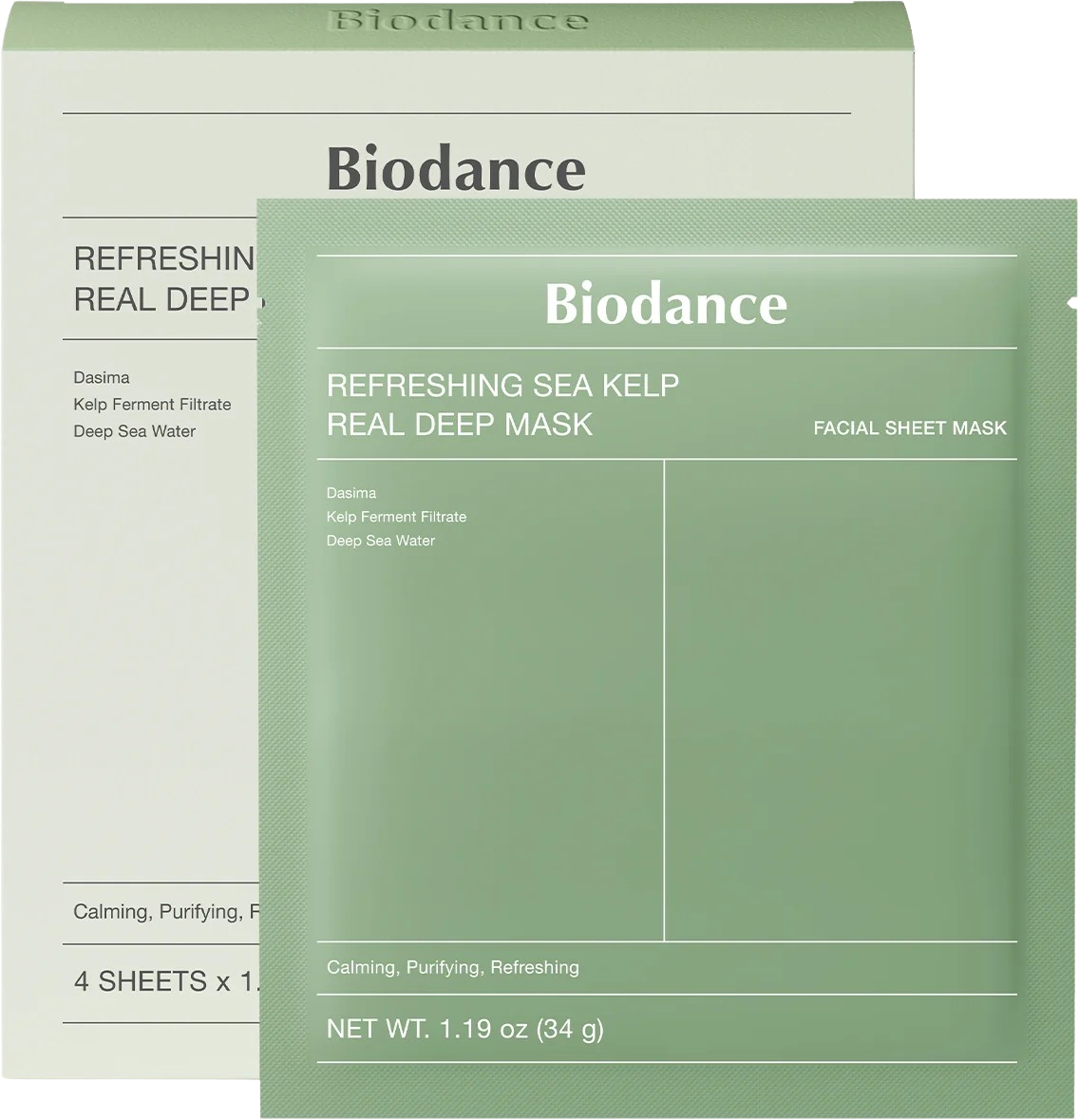 Refreshing Sea Kelp Real Deep Mask от Biodance съдържа 10% екстракт от морски водорасли и е истински game-changer. Тя успокоява кожата моментално и стабилизира естествения баланс между мазнини и влага. Минерално богата дълбоководна вода регулира излишния себум и укрепва бариерата. Намалява раздразненията и прави кожата видимо по-ясна и гладка. Уникалната хидрогел текстура прилепва идеално към лицето, осигурявайки максимално усвояване на активните вещества, като същевременно хидратира интензивно. Формулата е хипоалергенна и без дразнещи съставки – перфектна за мазна, комбинирана или стресирана кожа.