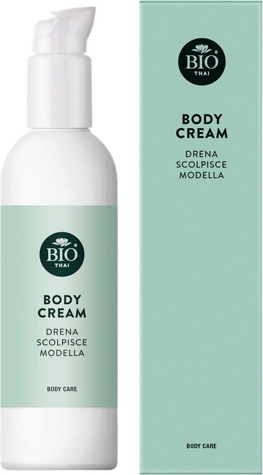 Drain Sculpt Model Body Cream от Bio Thai се основава на висококонцентрирана комбинация от растителни съставки, за да подпомогне елиминирането на излишните водни задържания. Така циркулацията се нормализира и вие се възползвате от по-красив външен вид на кожата, както и от усещане за лекота. Също така малките несъвършенства и целулитът се намаляват и структурата на кожата изглежда стегната и укрепена. Формулата разполага с почистващи и активиращи екстракти, като например от азиатска центела, лимон и джинджифил. Чисти етерични масла от оризови кълнове, кокос, пореч, лайм и босилек подсигуряват регенериращи и реструктуриращи свойства. Благодарение на шеа масло, кожата се тонизира и подхранва. Очаквайте изравнен външен вид на кожата и освежаващия характер на тази грижа за тяло!