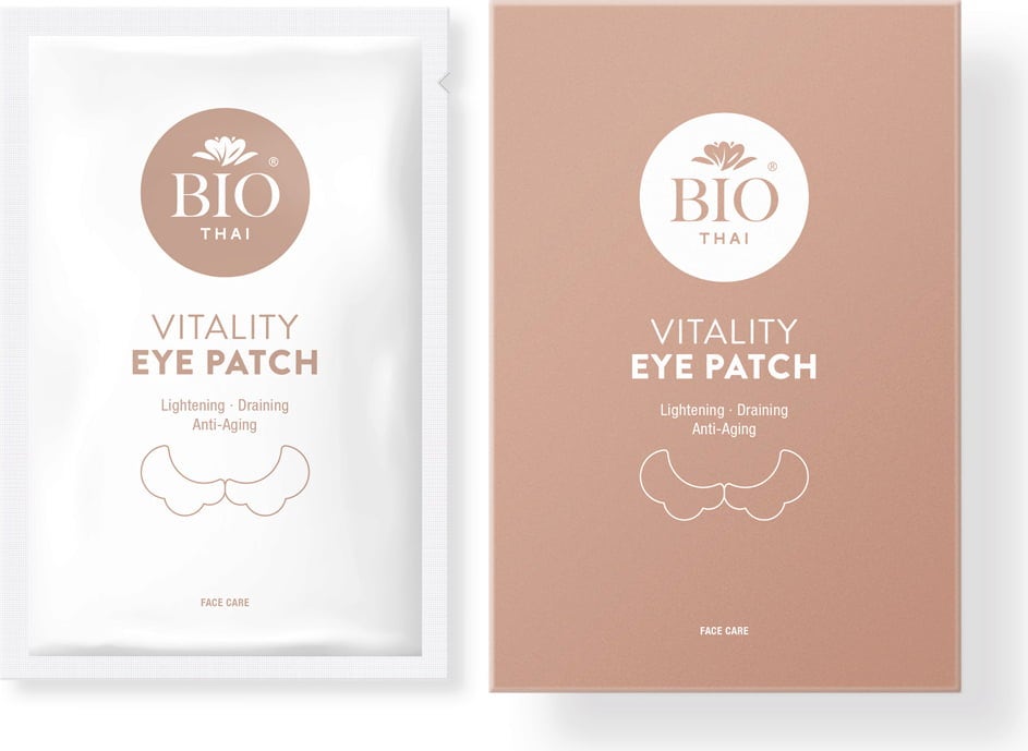 Пластирите за очи Vitality Eye Patch Bio Thai са изработени от 100% естествена материя, получена от растителните влакна на растението камелия, и имат фантастичен троен ефект. Пластирите за очи се грижат за тъмните кръгове, подпухналостта и първите признаци на стареене на кожата. Формулата с меча метла, танака и кофеин стимулира микроциркулацията и осигурява блясък. Същевременно Centella asiatica, камелия, акация и кафиров лайм оказват подхранващите си свойства и свеждат до минимум признаците на умора. Пептидите от пуерария, куркума и тамаринд също предлагат антиейдж свойства, в резултат на което кожата става по-гладка.