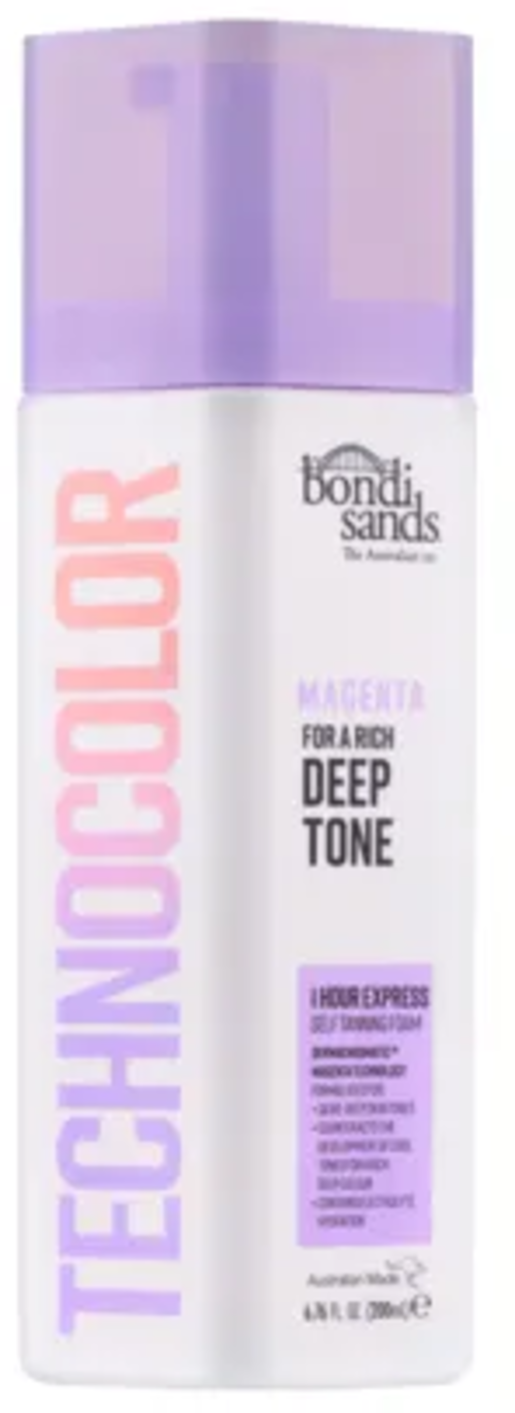 Technocolor 1 Hour Express Self Tanning Foam - Magenta от Bondi Sands е разработена чрез модерни технологии и анализи с лазерна технология за кожа, за да се адаптира перфектно към индивидуалния ви тен. Самобронзиращата пяна 1 Hour Express Magenta съдържа уникални съставки за бронзиране и усилватели на цвета Магента, и е специално подходяща за маслинени до тъмни тонове на кожата, които искат да постигнат наситен тен.