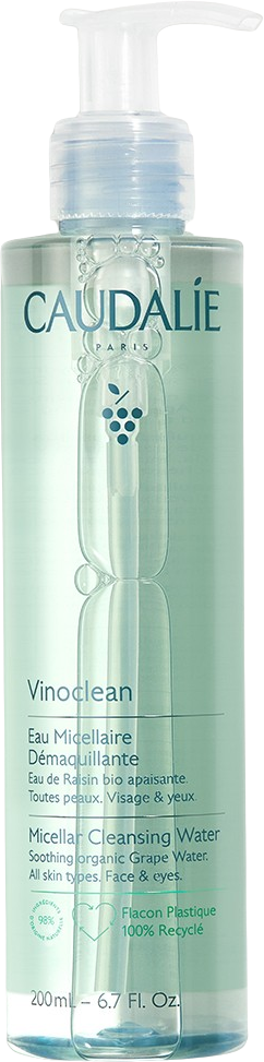 Vinoclean Micellar Cleansing Water на Caudalie предлага бързо и високоефективно решение за едновременно премахване на грим и почистване на кожата. Тя прави сутрешната и вечерната ви рутина лесна, тъй като почиства цялото лице и премахва дори упорития грим от очите – без да нарушава естествения баланс на кожата. Подходяща за всички типове кожа, тази мицеларна вода глези кожата ви с 98% съставки от натурален произход. Веганската формула е обогатена с лайка и органична гроздова вода, които не само избистрят, но и интензивно хидратират и видимо успокояват кожата ви. Резултатът е чисто, меко и подхранено усещане.