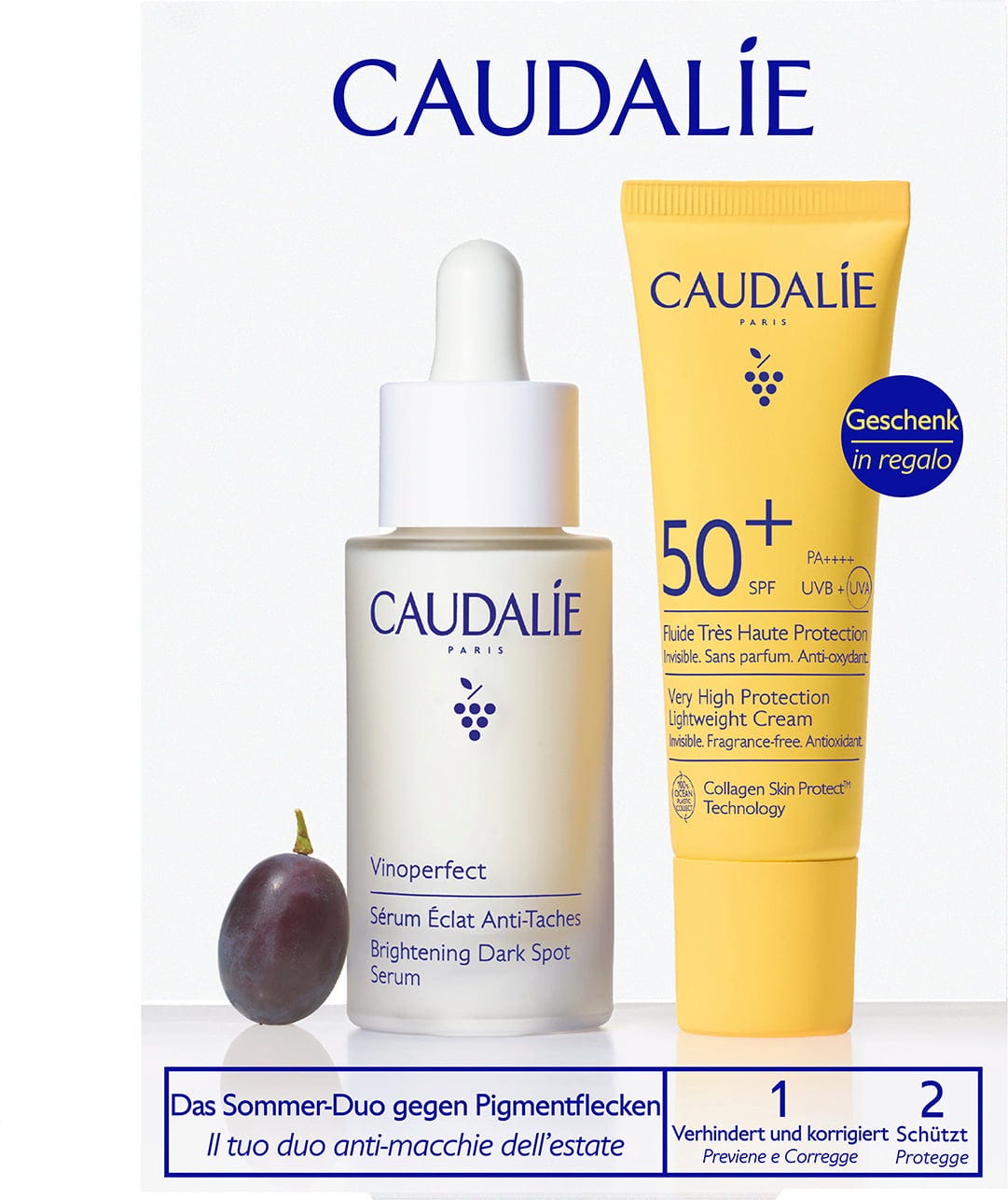 Vinoperfect Summer Duo 2026 от Caudalie ви предлага летния блясък в двойна опаковка: вземете перфектния комплект за равномерен, дълготраен тен без съжаление. Серумът Vinoperfect просто извиква тъмните петна и кара тена ви да сияе. Като бонус в комплекта е включен флуид SPF 50+ като подарък - свръхлека защита за лицето и шията, която се усеща като коприна. И двата акцента ухаят чудесно на лято и се абсорбират веднага.