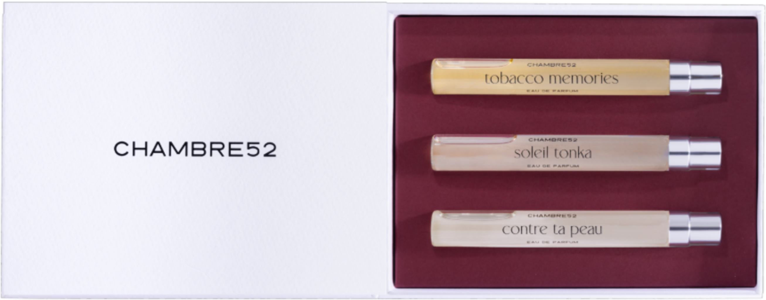 Комплектът за пътуване на Chambre52 е елегантен комплект с 3 мостри на аромати от по 10 ml всяка - идеален, ако искате да изпробвате гъвкаво различни ароматни композиции. Удобните флакони с парфюми се побират лесно във всяка чанта и ви позволяват да имате любимия си аромат винаги със себе си. Независимо дали става дума за пътуване, специални поводи или изискан подарък - този комплект перфектно съчетава елегантност и изразително разнообразие.