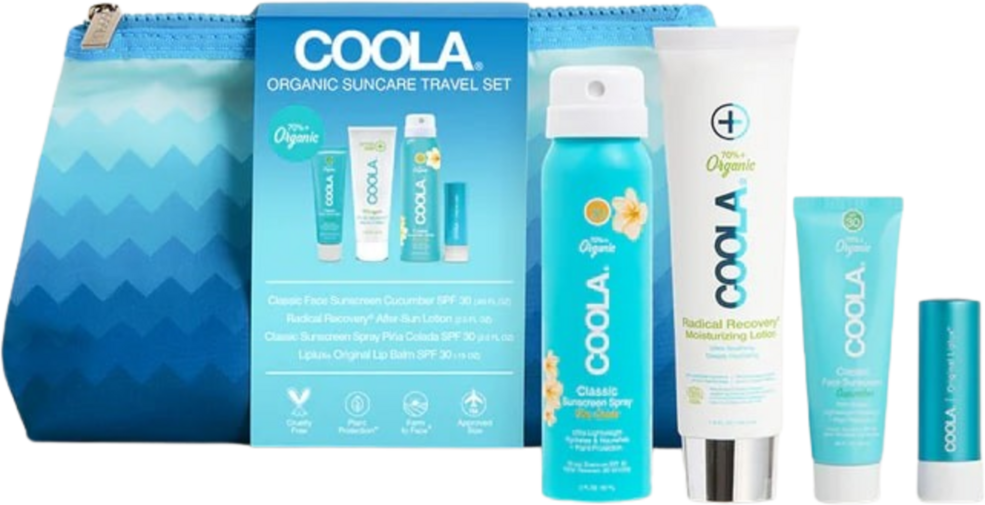 Комплектът за пътуване със слънцезащита от COOLA съдържа четири продукта за идеална защита от слънцето и грижа след излагане на слънце. Подходящи са за всички типове кожа, включително за чувствителна или суха кожа. Опаковани в красива синя чантичка, козметиките лесно се съхраняват и могат да бъдат взети навсякъде. Комплектът е и отлична идея за подарък за любителите на лятото и слънцето.