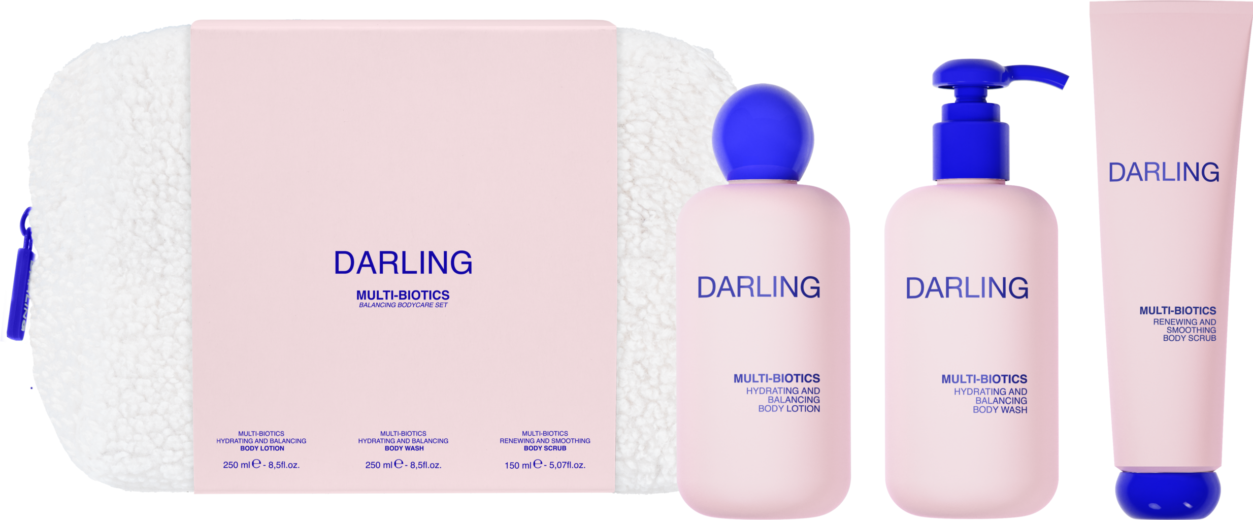 Multi-Biotics Balancing Body Care Set от DARLING е балансиран пакет, който осигурява интензивна грижа за вашата кожа и може да се използва през цялата година. Всички продукти от линията Multi-Biotics ви очакват в оригинален размер в красива, мека козметична чанта: душ гел, лосион за тяло и пилинг. Всички продукти имат балансиращ, регенериращ и интензивно грижовен характер и омайват сетивата с флорално-дървесен аромат.