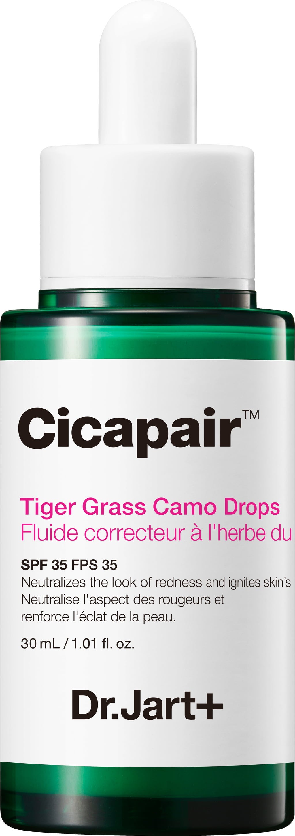 Cicapair™ Tiger Grass Camo Drops SPF 35 от Dr. Jart+ се адаптира индивидуално към всеки тен на кожата и може да неутрализира и изравни раздразнените участъци на лицето. Така кожата изглежда по-равномерна и тенът започва отново да сияе. Формулата с ниацинамид също така притежава защитен характер, докато тигровата трева успокоява и релаксира кожата. Благодарение на цинков оксид и титанов диоксид, серумът със слънцезащитен фактор 35 предпазва и от UVA и UVB лъчи.