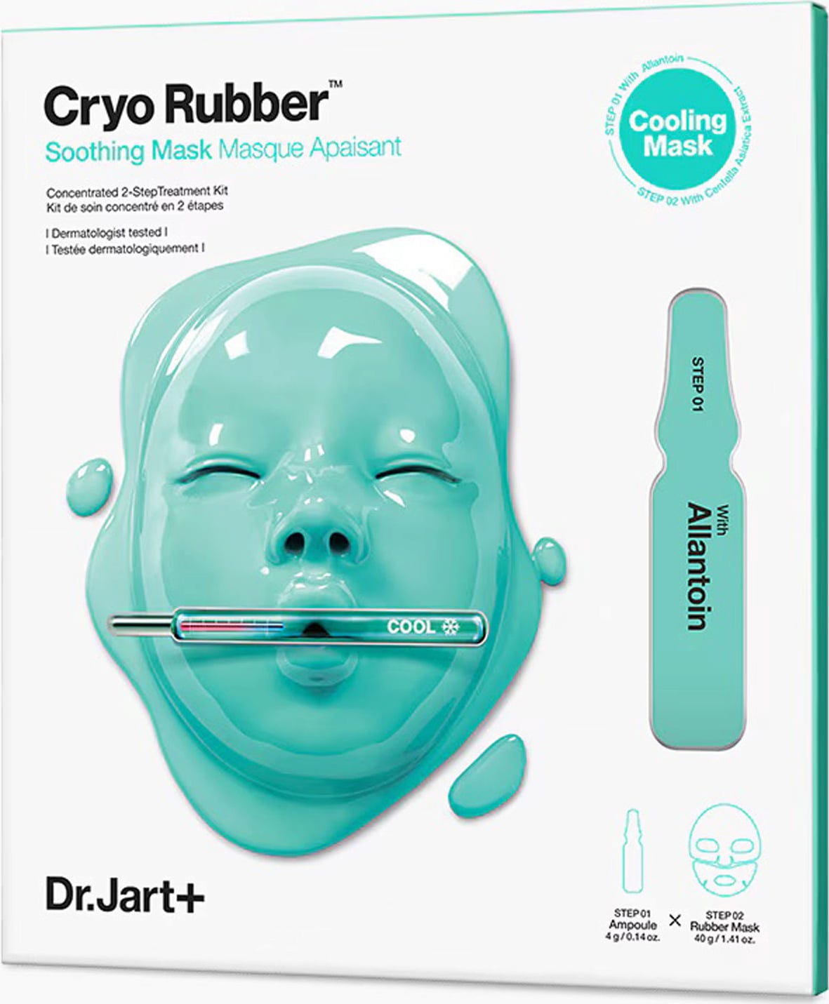 Cryo Rubber™ Soothing Mask от Dr. Jart+ е маска за лице, която балансира чувствителна, раздразнена или стресирана кожа. Освен маската получавате ампула, която е пълна с гелообразен серум. Той е формулиран с комплекс от алантоин, който след това се захваща от маската. Комбинацията от овлажняваща маска и регенериращ серум ви предоставя интензивно усещане за грижа и ви дарява с добре хидратирано, балансирано и спокойно кожно усещане.