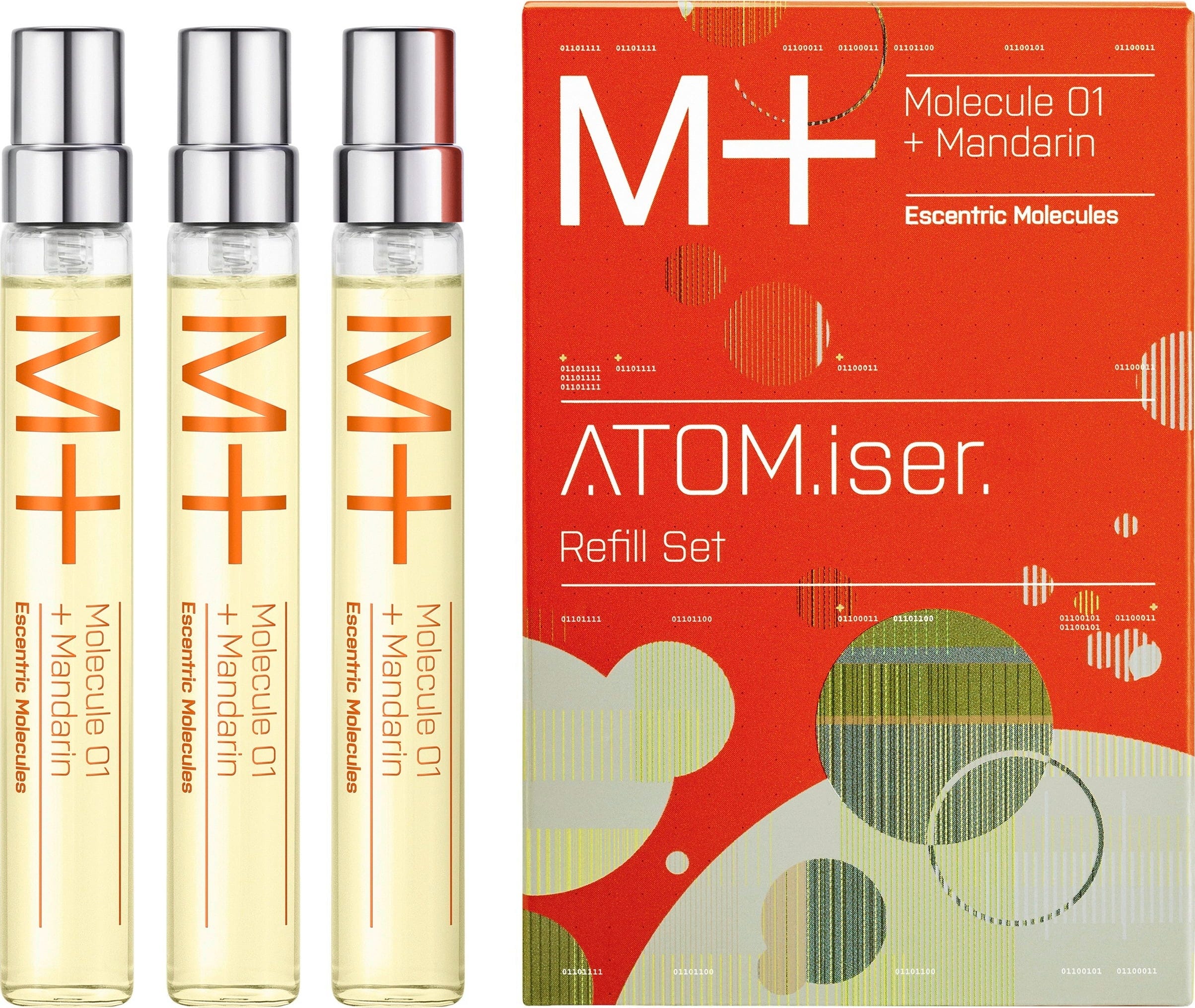 Комплектът за пълнене Molecule 01 + Mandarin ATOM.iser от Escentric Molecules се състои от три тоалетни води за ATOM.iser и луксозен, удобен калъф за пътуване.