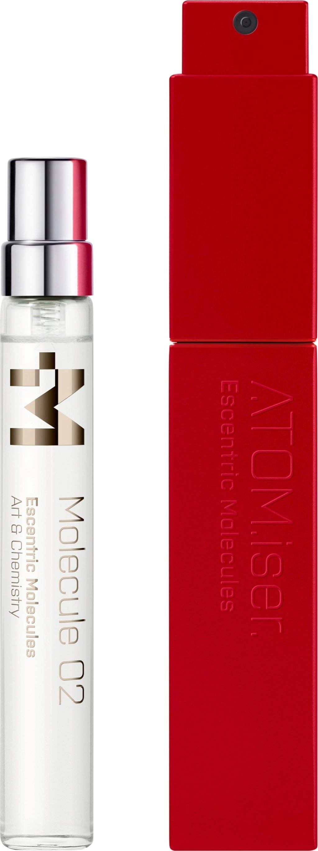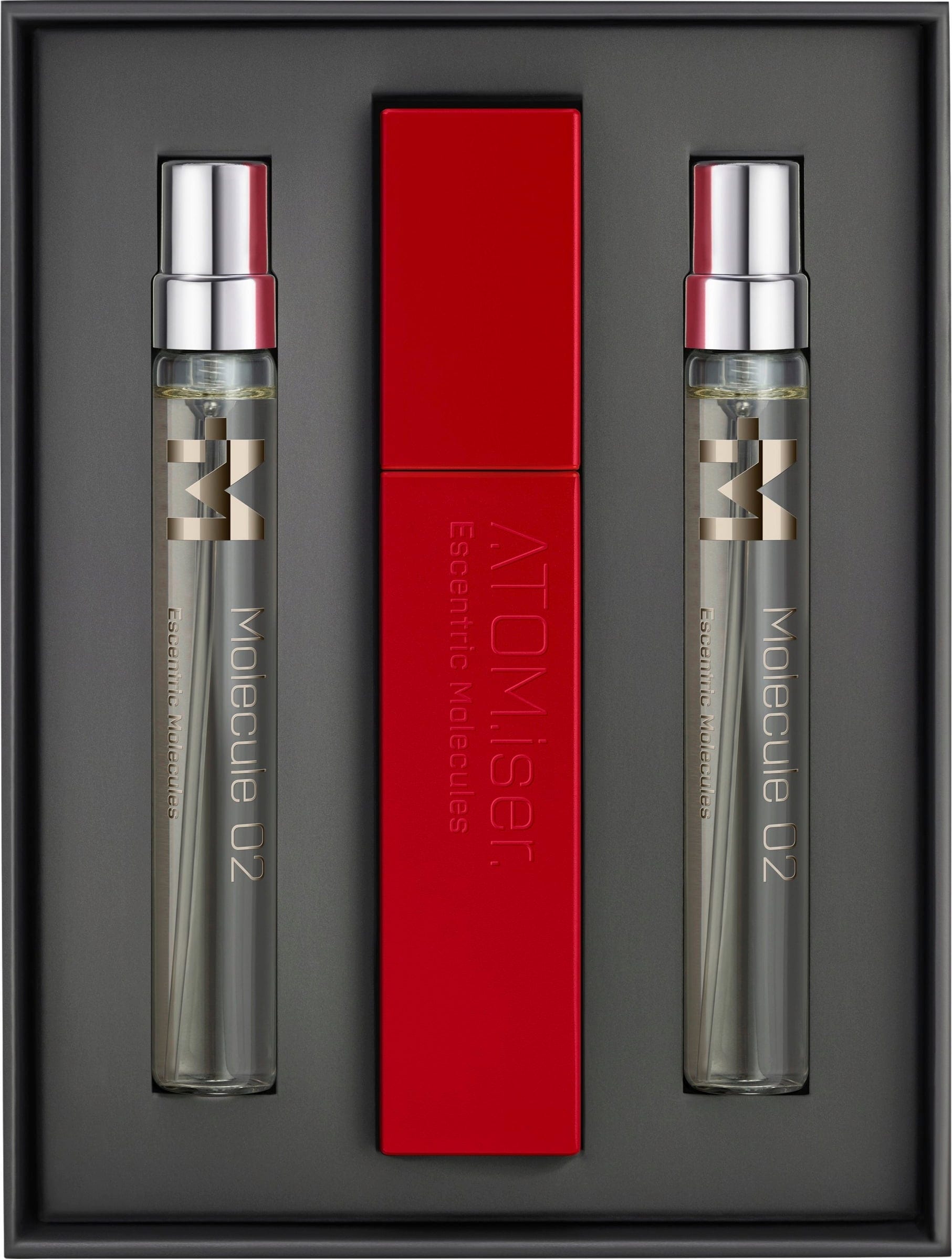 Комплектът Molecule 02 ATOM.iser от Escentric Molecules е луксозен комплект, състоящ се от три тоалетни води Molecule 02 в размери за пътуване и удобна кутийка за парфюм, проектирана за издръжливост и луксозен комфорт при пътуване, за да допълни перфектно вашия начин на живот в движение.