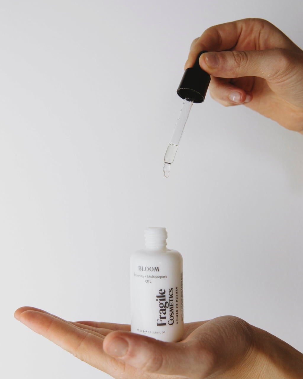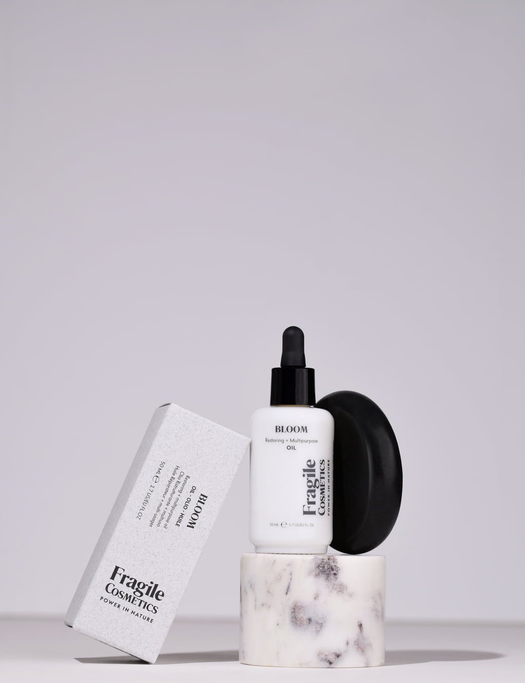 BLOOM Restoring + Multipurpose Oil от Fragile Cosmetics се основава на питателна смес от растителни масла, масла и протеини. То ремонтира и укрепва косата и скалпа, оставяйки ги видимо подхранени, меки и блестящи. Формулата е изградена върху масла от слънчоглед, ленено семе, бадем, невен, семена на пореч, смокиня и бакучиол. Те са особено богати на Омега-3 мастни киселини, антиоксиданти и витамин Е, които предотвратяват чупенето на косата, защитават натурално от слънчеви лъчи, възстановяват структурата и придават блясък и обем. Маслото също така подкрепя косопад или преждевременно посивяване, като ремонтира и заздравява космените фоликули.