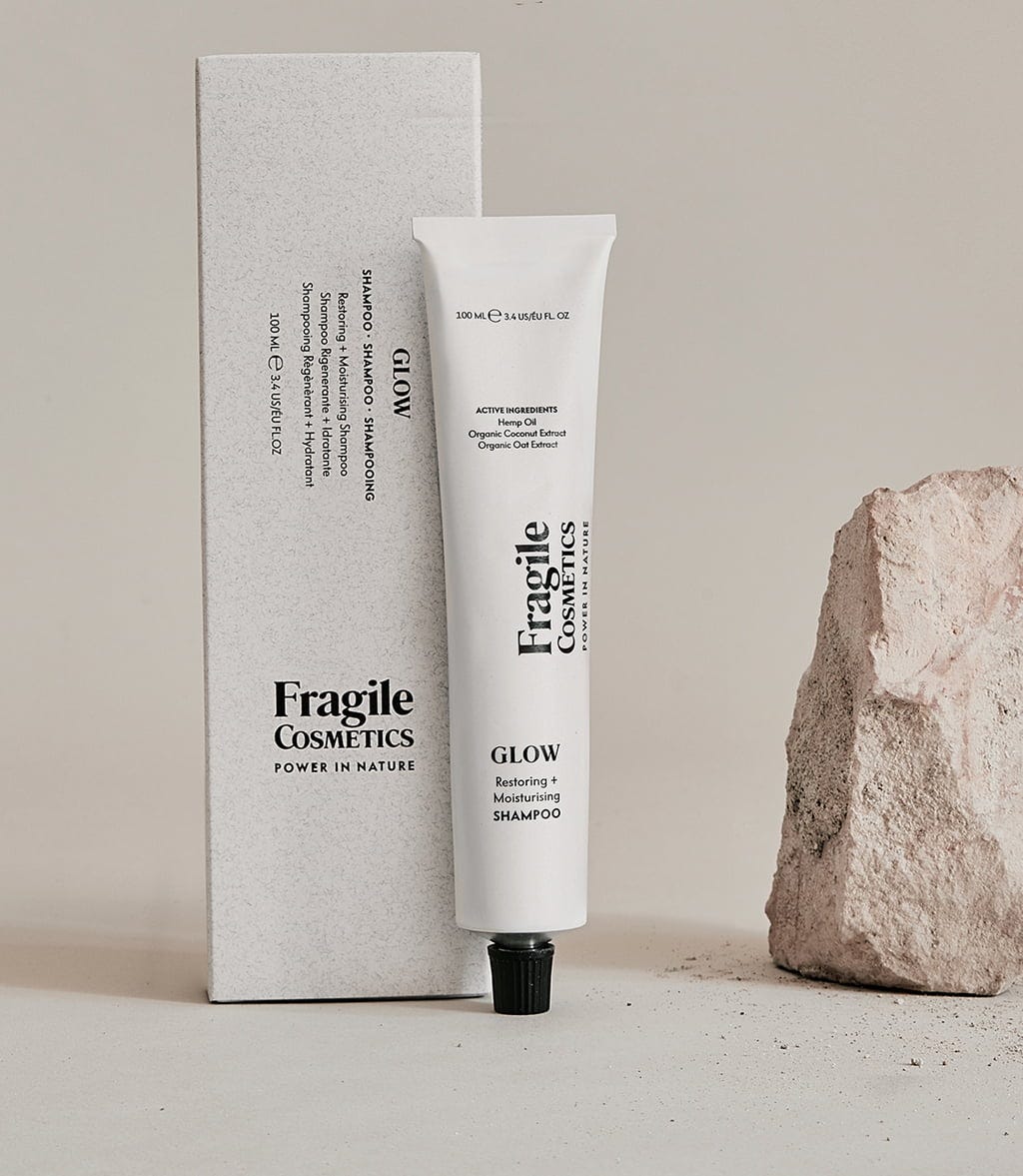 GLOW Restoring + Moisturising Shampoo от Fragile Cosmetics е създаден от устойчива смес с над 97% натурални съставки и почиства косата деликатно с био-екстракти и чисти растителни масла. Поддържа влагата в скалпа и придава блясък и сила на косата. Шампоанът съдържа био-екстракт от овес, който стимулира растежа на косата и образува защитен филм около всяко косъмче. Подкрепен е от витаминозен, антиоксидантен био-екстракт от кокос, който укротява дори начупената коса и я структурира красиво. Благодарение на своята маслена структура, сходна с тази на косата ни, мазнините проникват дълбоко в косъма и му осигуряват интензивна хидратация. Резултатът е коса като коприна, изключително мека на допир.