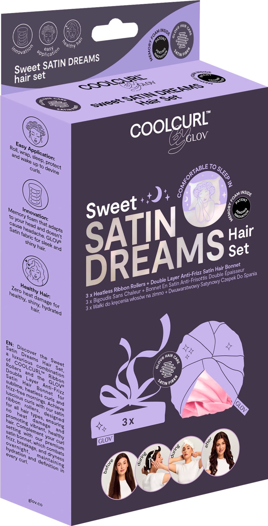 Открий комплекта Sweet Dreams Satin – луксозна комбинация от COOLCURL™ Ribbon ролки и двойнослойна сатенена шапка против наелектризиране на косата. Заедно те ти обещават къдрици без топлина и сутрини без фриз ефект. Създадени са за всички типове коса и са изключително щадящи към нея. Сатененият тюрбан предпазва косата от накъсване, загуба на влага и начупване, като запазва оформените къдрици.