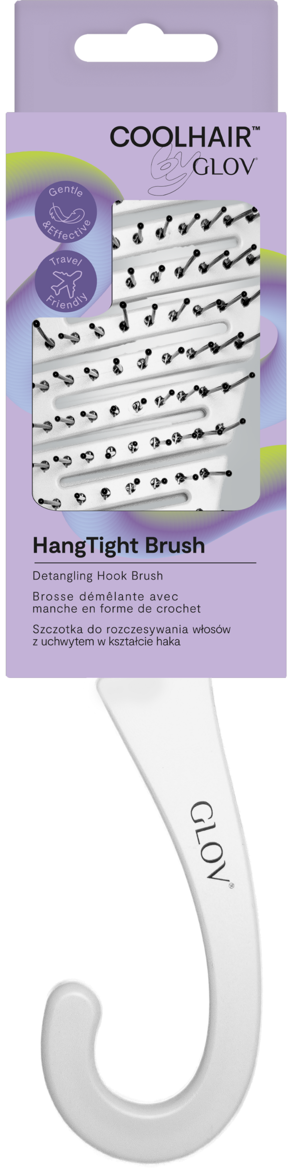 Моделът HangTight Brush е създаден, за да се забива навсякъде, където пожелаете, само не и в косата ви! Благодарение на гъвкавите си косъмчета със заоблени върхове тя се плъзга по косата ви особено нежно и разплита без усилие и безболезнено. Ергономичната дръжка осигурява добър захват, а формата на кука гарантира, че четката е винаги там, където искате: на решетката на душа, на закачалката за кърпи или на куката в банята.