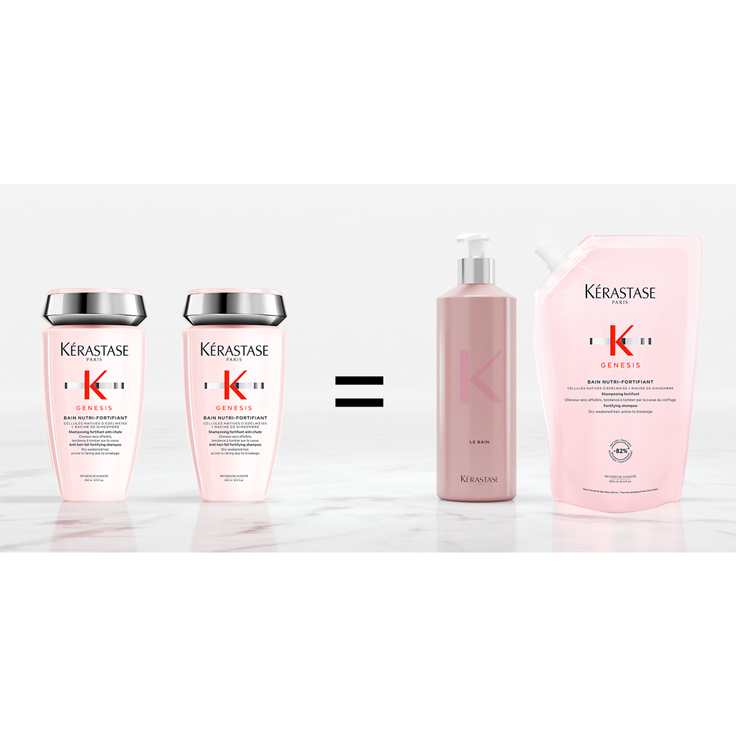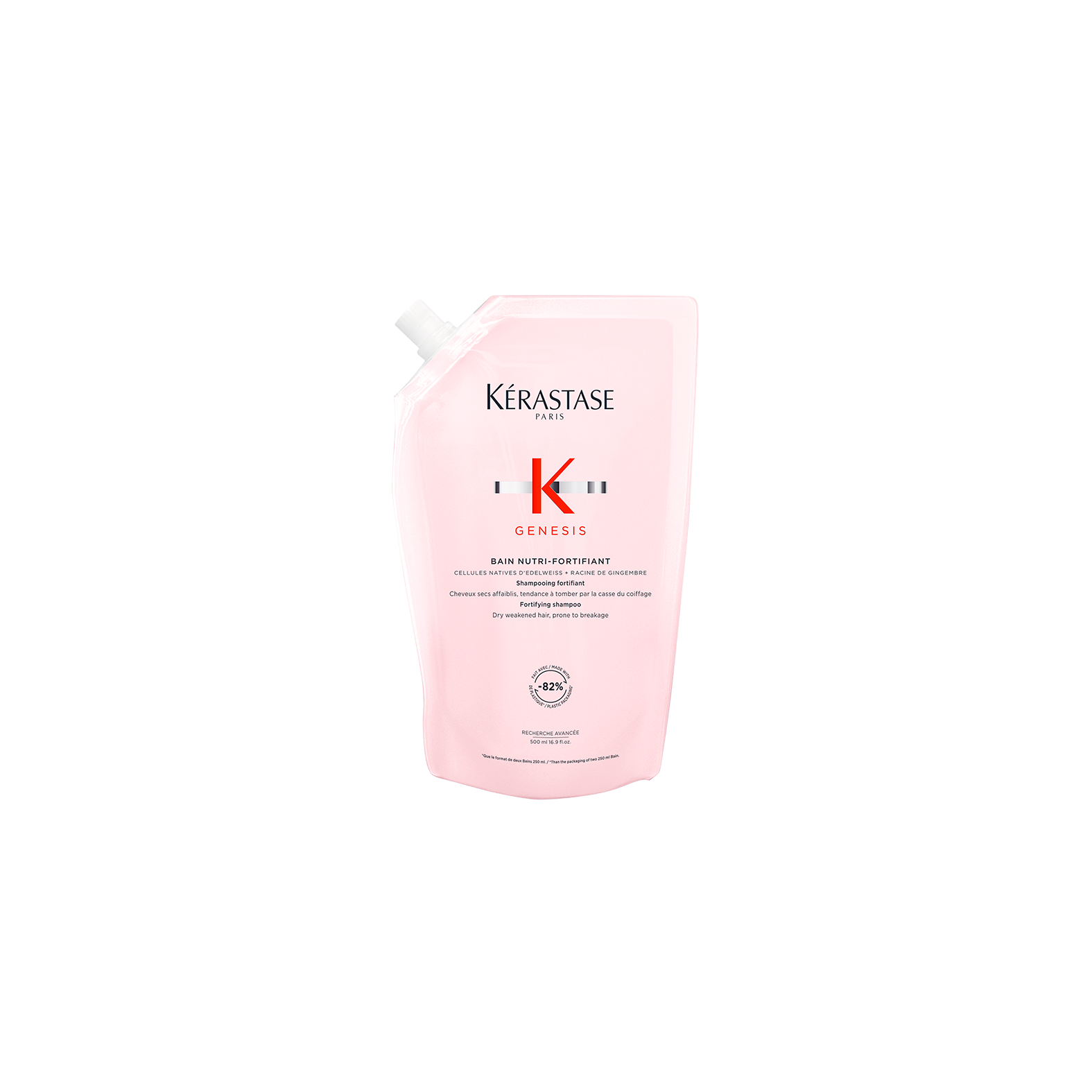 Genesis Bain Nutri-Fortifiant пълнител от Kérastase ви дава възможност да зареждате устойчиво любимия си шампоан. Висококачествената формула е обогатена с корен от джинджифил и еделвайс и е разработена специално за суха коса. Тя повишава устойчивостта на косата и подобрява разресването, за да придаде блясък на косата от корена до върховете.