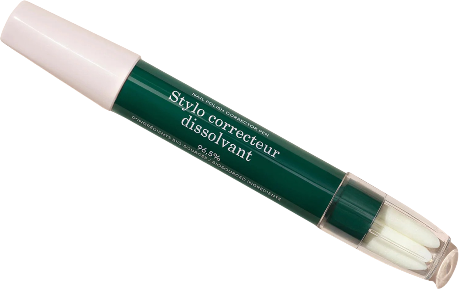 Corrector Pen от Manucurist е незаменим инструмент за всички, които държат на оптимален маникюр. Той премахва малки грешки при нанасяне на лак с лекота и осигурява професионален завършек като от студио. Биобазираната формула на коректорния молив е напоена с безацетонов лакочистител, който прави почистването не само прецизно, но и щадящо към кожичките. Вместо да изсушава контурите, моливът действа успокояващо и подхранващо. Благодарение на удобната си форма го водите сигурно по нокътното легло, за да коригирате излишния цвят без остатъци. За да се радвате дълго на своя beauty tool, в комплекта са включени три резервни върха – за чиста рутина при всяка нова визия.