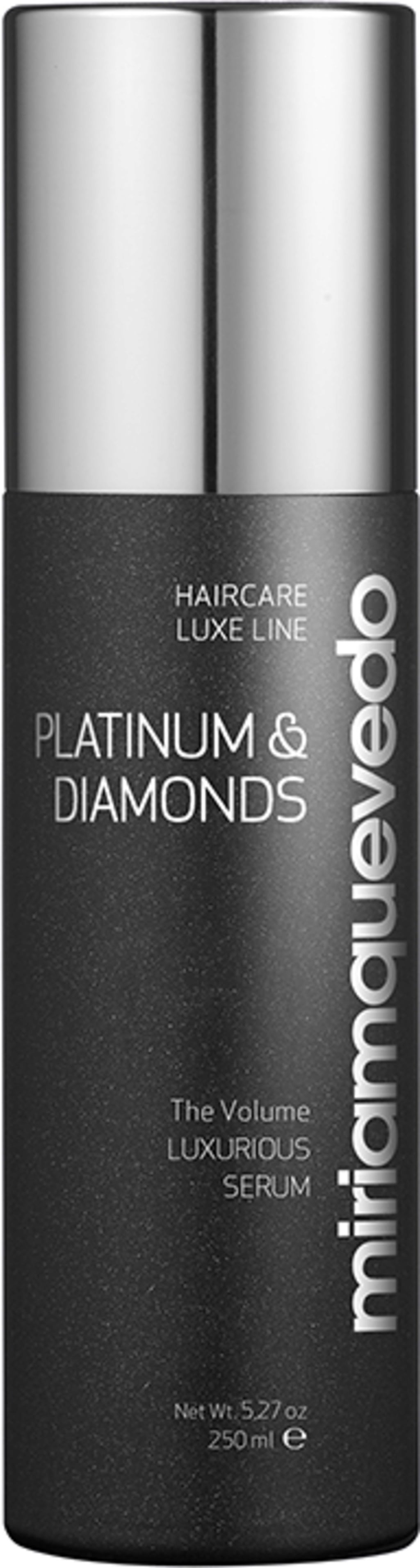 Platinum & Diamonds The Volume Luxurious Serum от Miriam Quevedo е обогатен с 23 ценни активни съставки, които осигуряват регенерация, придават обем на косата и предлагат анти-ейдж ефект. Неговата система за защита и реконструкция с кератин се свързва с косъма и създава запечатка, която задържа влагата, предпазва от топлина и противодейства на признаците на механично и химическо стареене. Серумът също така улеснява разресването, предпазва от скъсване на косата и я прави гладка. Очаквайте също така по-обемна коса и изключителен диамантен блясък.