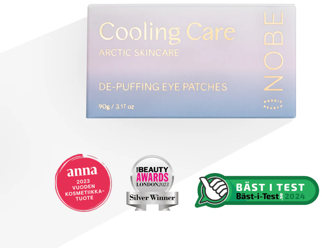 Cooling Care De-Puffing Eye Patches от NOBE са охлаждащи, хидратиращи и премахващи подпухналостта хидрогел пачове за очи с ксилитол и комбинация от пет растителни екстракта. Ксилитолът от качествени овесени люспи ефективно свързва влагата в кожата и има охлаждащи свойства. Освен това е пребиотичен съставка, подпомагаща естественото микробиом на кожата и укрепва кожната бариера. Хидро-пачовете съдържат още екстракти от алое вера, морски водорасли, ямс, корен от бряст и теменуга, които общо имат охлаждащо и силно хидратиращо действие, като същевременно защитават кожата с антиоксиданти.