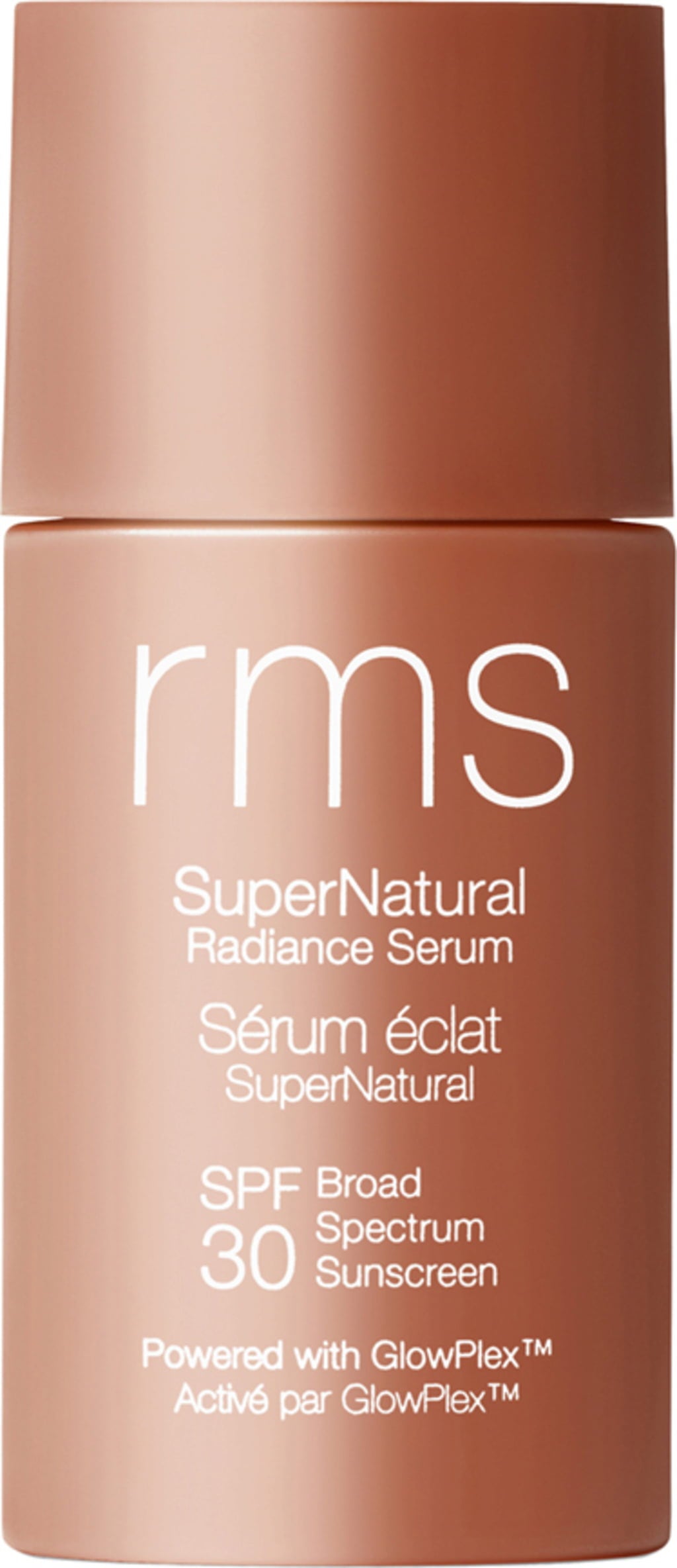 SuperNatural Radiance Serum SPF 30 от RMS Beauty тонира, подхранва и коригира тена, като предоставя и минерална защита с фактор 30. Леката текстура се приспособява комфортно към кожата, заличавайки неравности, осигурявайки естествен блясък и ефект на мек фокус. Технологията GlowPlexTM, включваща ниацинамид и естествени пептиди от екстракт от киноа и грах, също така изглажда кожата и придава мигновен блясък. Освен това серумът съдържа железни оксиди и екстракт от розова герания, предоставяйки допълнителна защита срещу синя светлина.