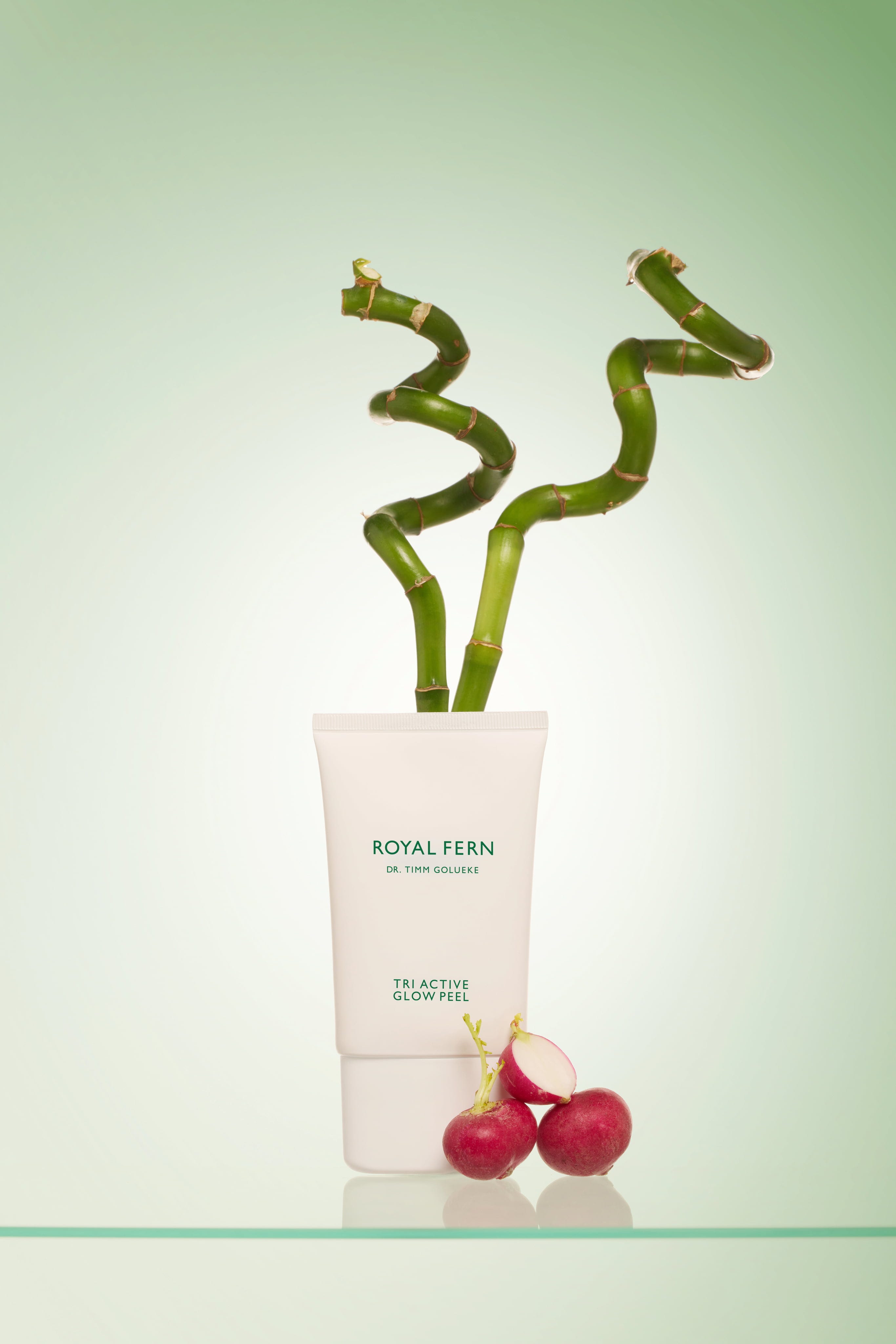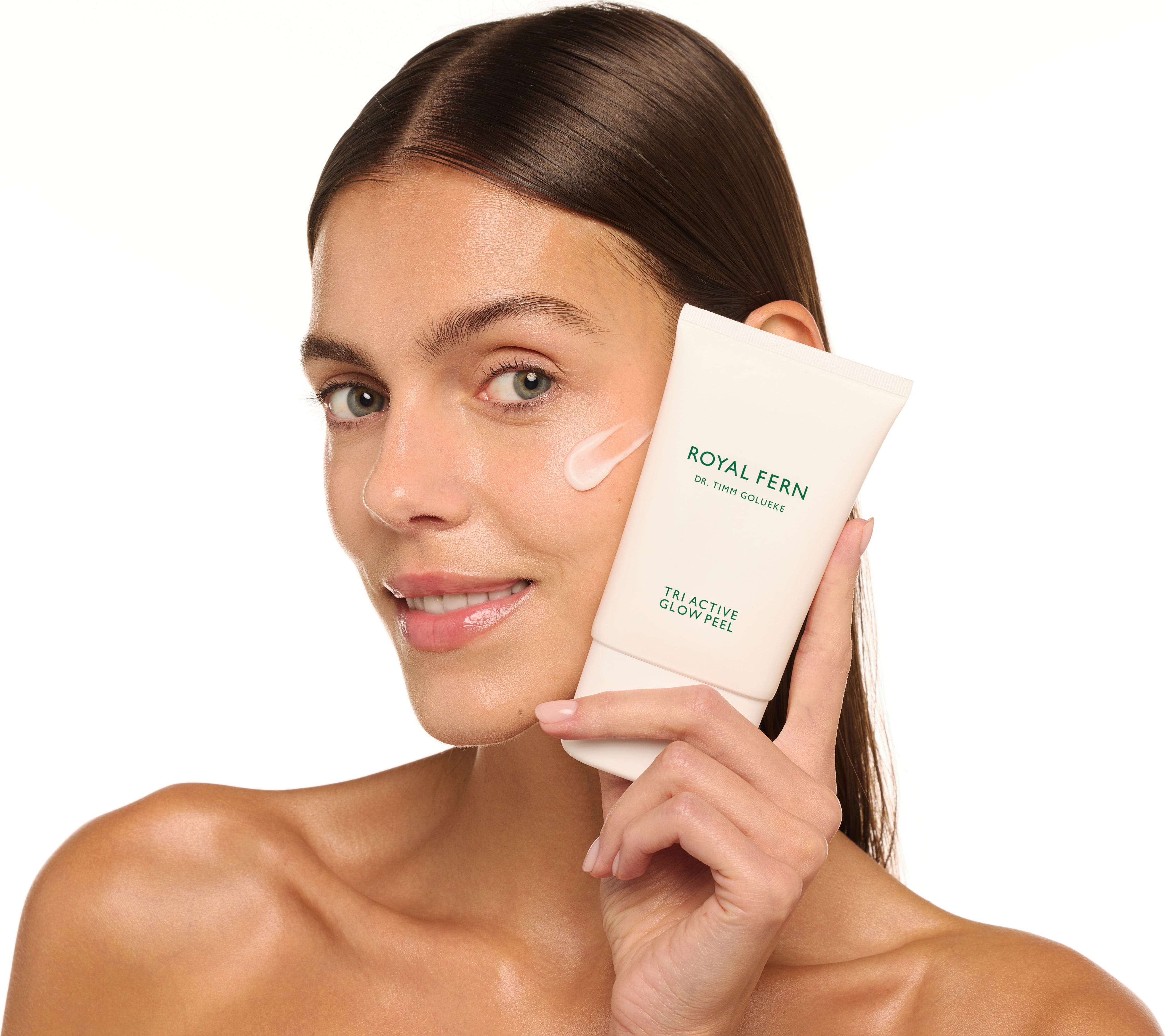 Пилингът Tri Active Glow на Royal Fern комбинира химични, ензимни и механични технологии за ексфолиране, за да премахне нежно мъртвите кожни клетки и да остави кожата ви сияйна. Комбинацията от 12% AHA и PHA, ферментирали ензими от корен на репички и ултрафин бамбуков прах усъвършенства текстурата на кожата, избистря я и я оставя копринено гладка. Формулата подпомага обновяването на клетките, като същевременно осигурява видимо по-свеж и равномерен тен. Използван редовно, пилингът може да съживи уморената, матова кожа и да създаде сияен блясък – идеален като допълнение към вашата домашна рутинна грижа за кожата.
