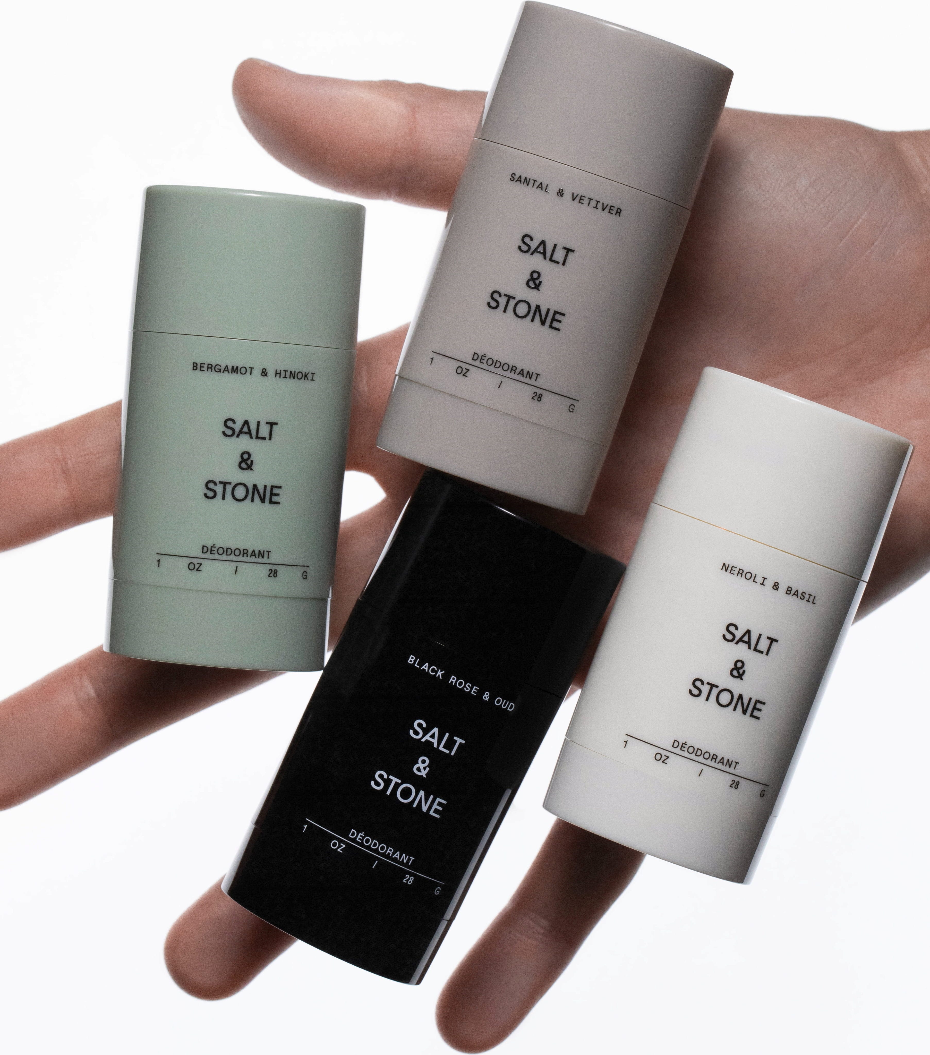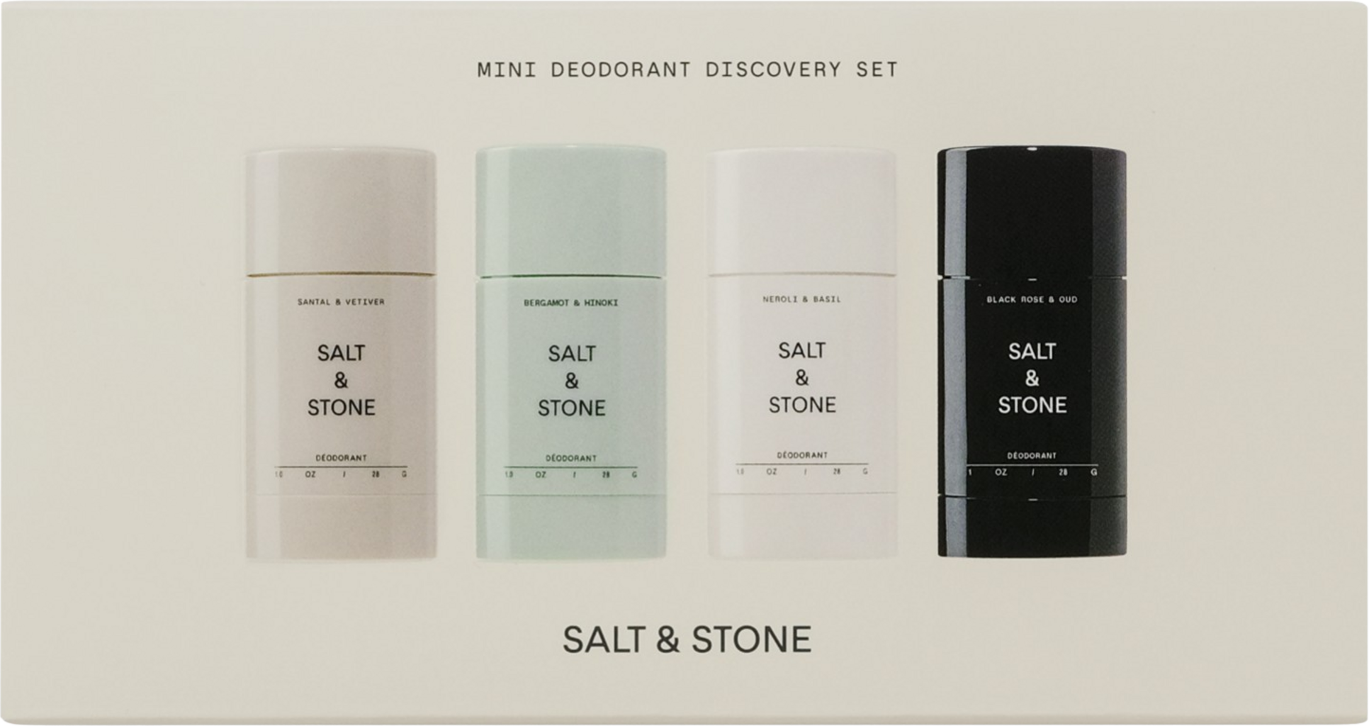 Комплектът Mini Deodorant Discovery Set от SALT & STONE съдържа четири дезодоранта с награждавани аромати – перфектно въведение, идеален подарък или практичен размер за пътуване за вашата ежедневна грижа. Формулата на стиковете включва хидратиращи екстракти от водорасли и хиалуронова киселина, докато пробиотиците неутрализират неприятните миризми. Антиоксидантната спирулина подпомага регенерацията на кожата, а подхранваща комбинация от кокосово масло, масло от шеа и слънчогледово масло се грижи за деликатната кожа под мишниците.