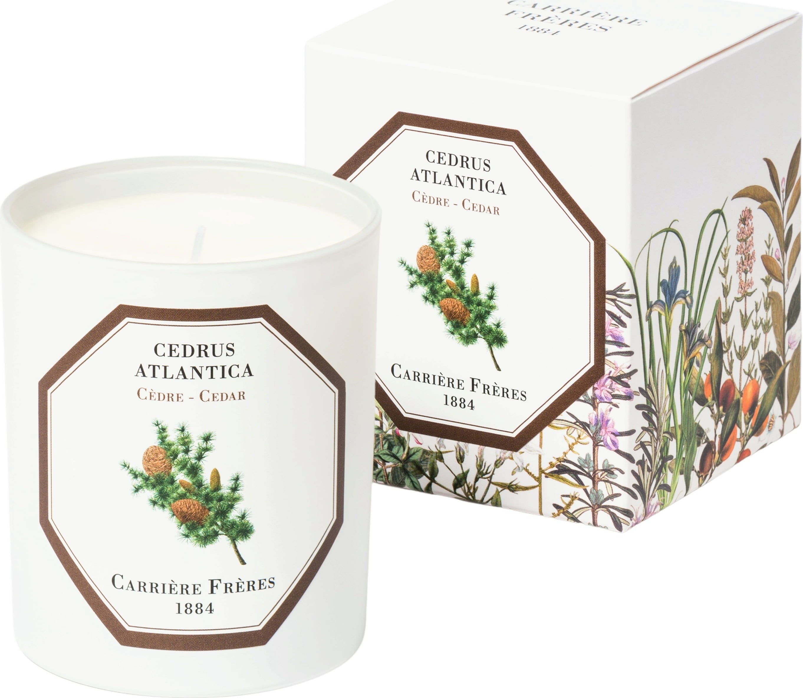 Ароматната свещ Cedar от Carrière Frères предлага сухи, дървестни, обгръщащи и успокояващи тонове. Неговата смолиста основа разкрива също определена свежест. Кедърът е особено ценено дърво в парфюмерията, което придава топлина и има почистващи свойства. Ароматът излъчва нежност и спокойствие, особено в моменти, когато не всичко върви по план.