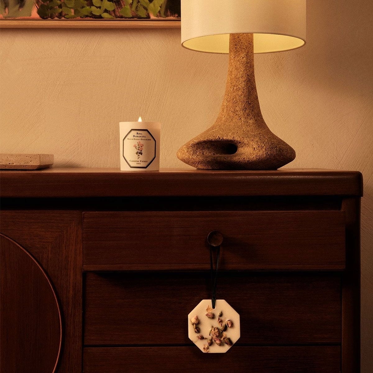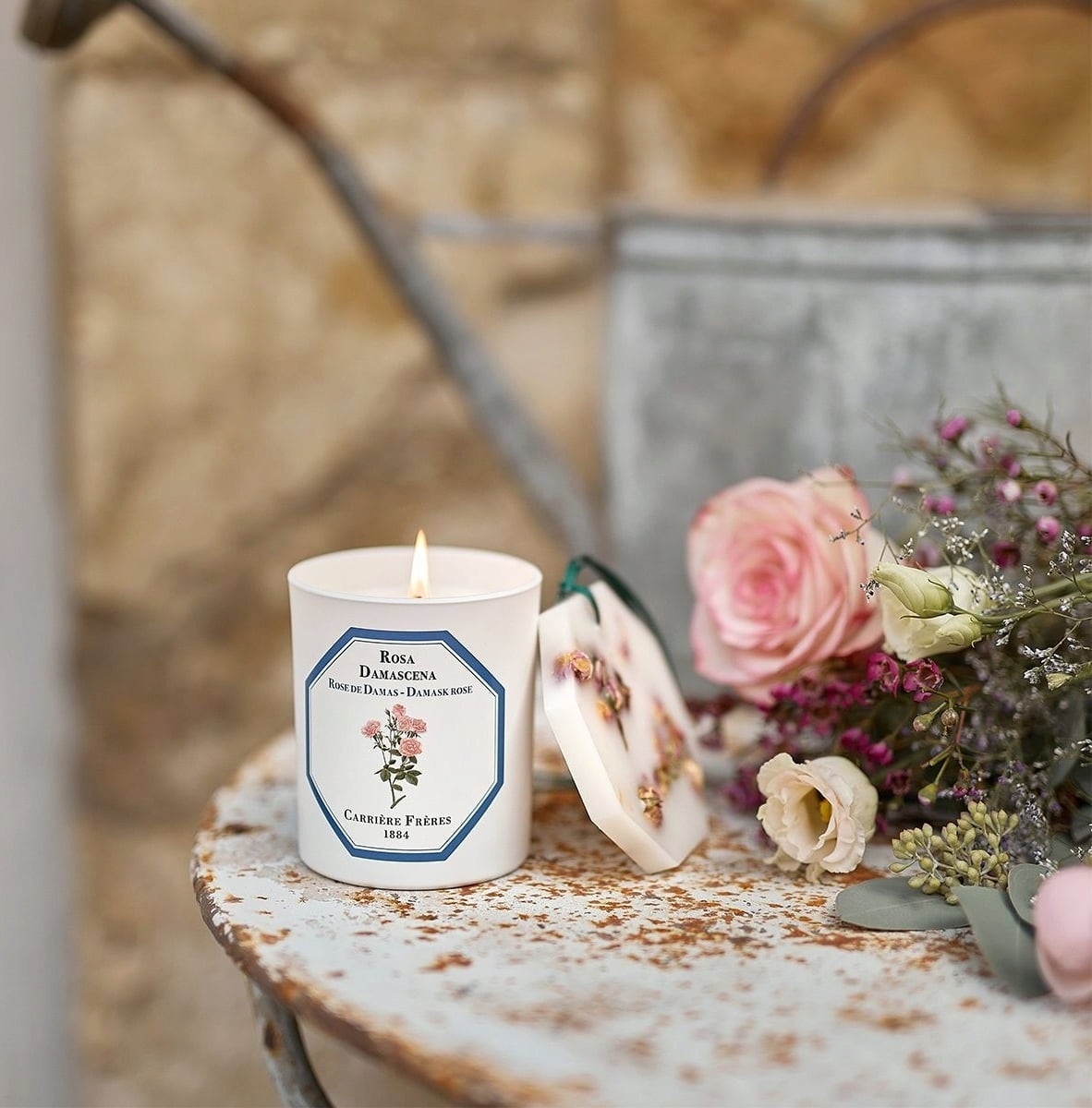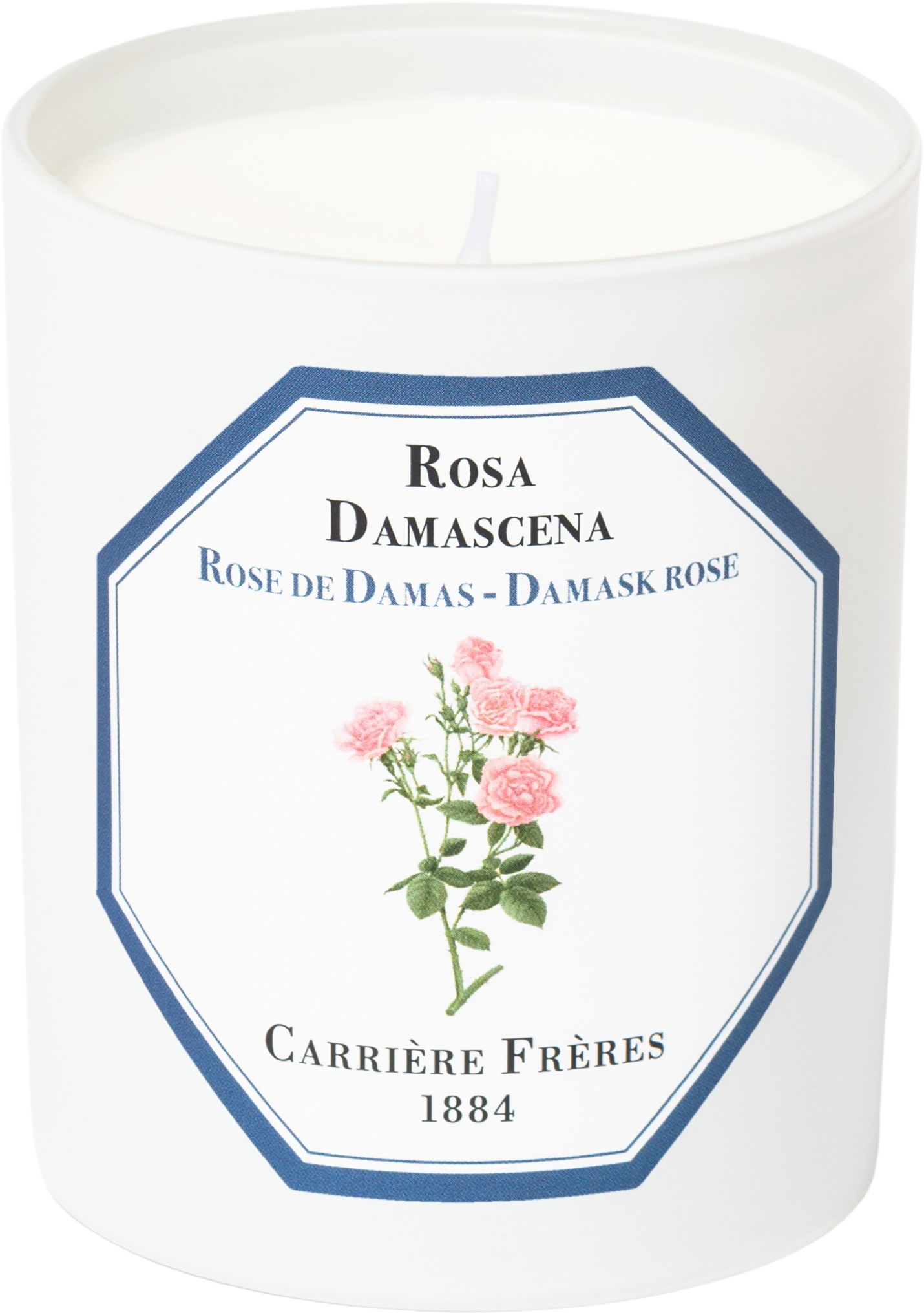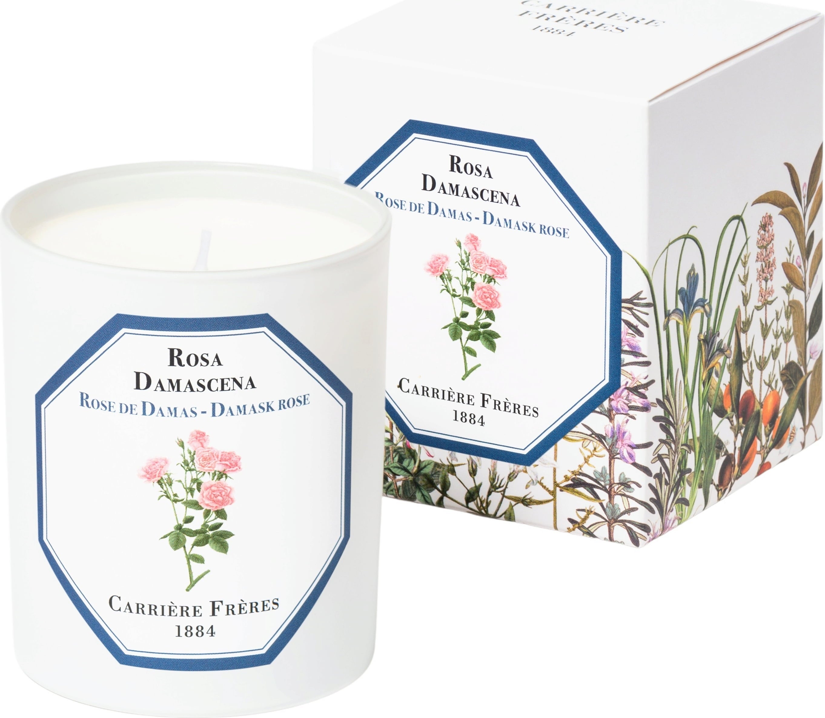 Ароматната свещ Дамасцена роза от Carrière Frère разпространява великолепен и ярък аромат. Дамасцената роза е високо ценена заради своя сладък, плътен и изискан аромат и заслужава прозвището „Кралицата на цветята”. Розата е силно ароматна и притежава активиращи и афродизиакални свойства. Освен това, ароматът създава хармонична и спокойна атмосфера.