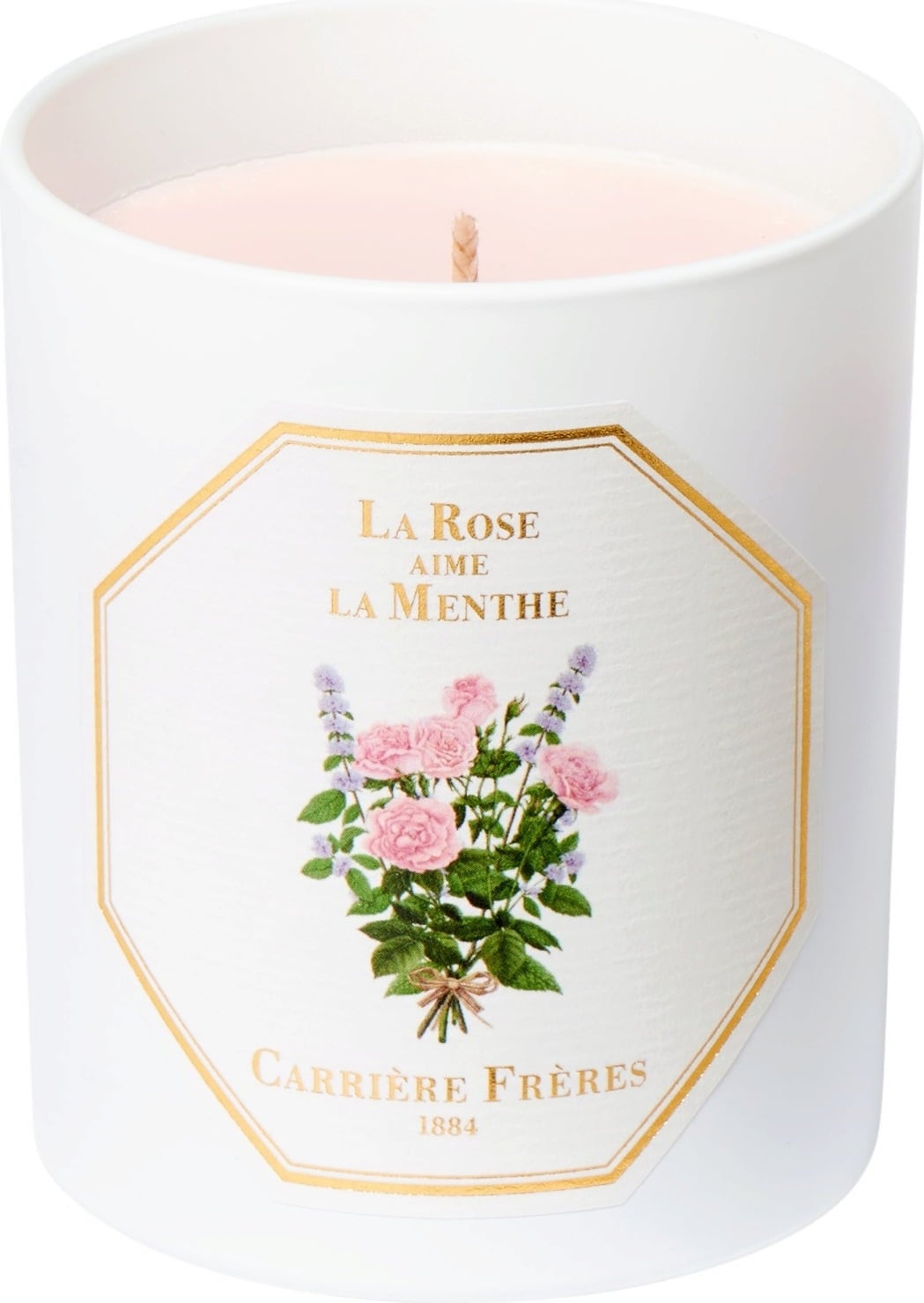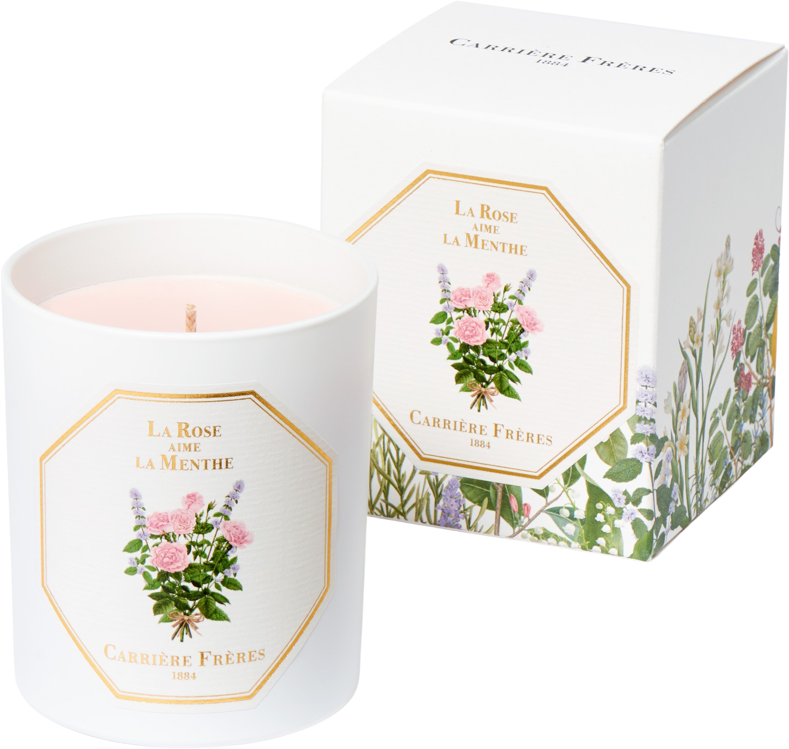 Ароматната свещ "La Rose aime la Menthe" от Carrière Frère омагьосва в студеното време с билковия си аромат на свежа мента. Когато е топло, деликатният аромат на роза изпъква още повече. Розата гордо представя своето изящно цветно коронче, разкривайки финеса на своя аромат. В контраст, джодженът се отличава с ободряващ и деликатен характер. Заедно те създават хармония и успокояват ума.