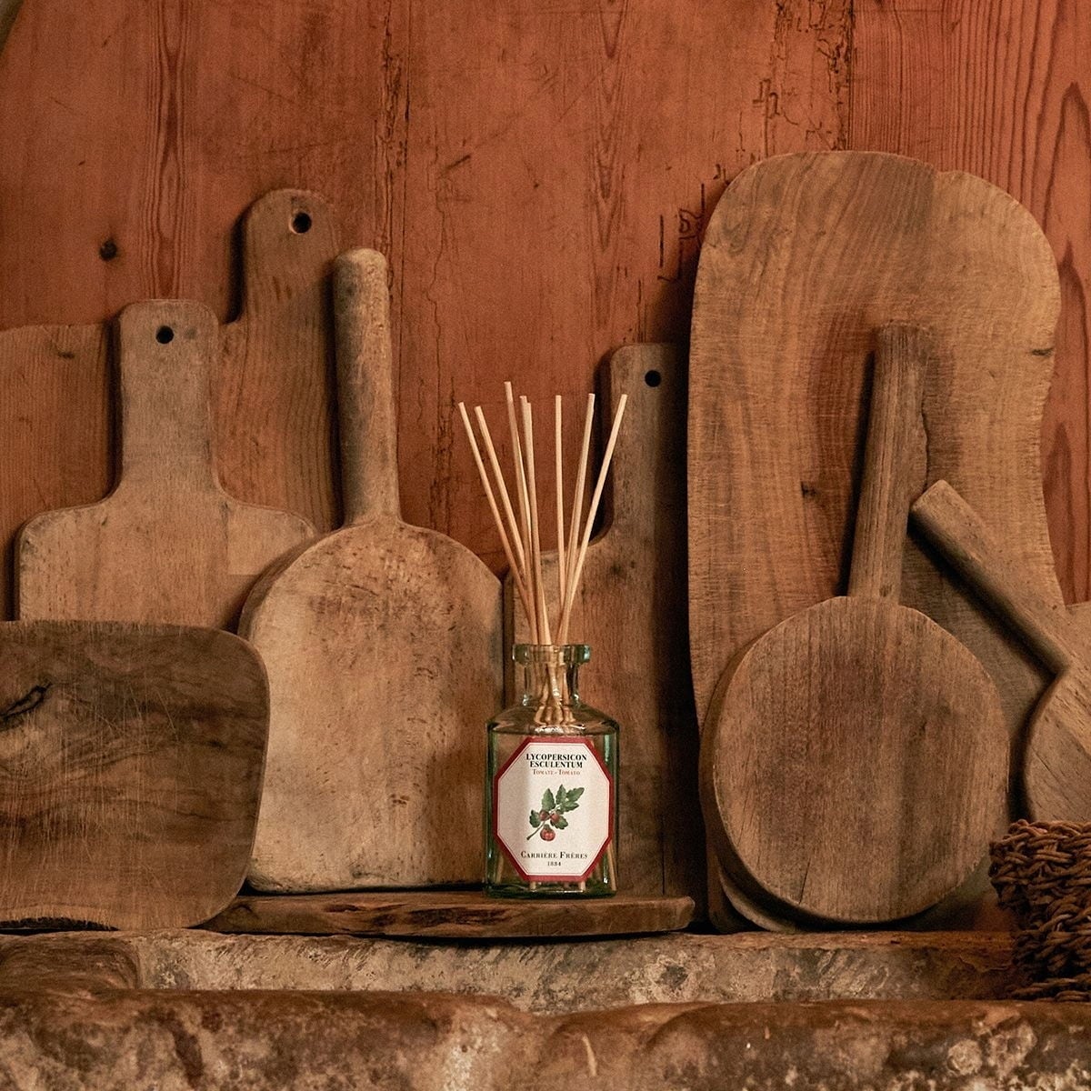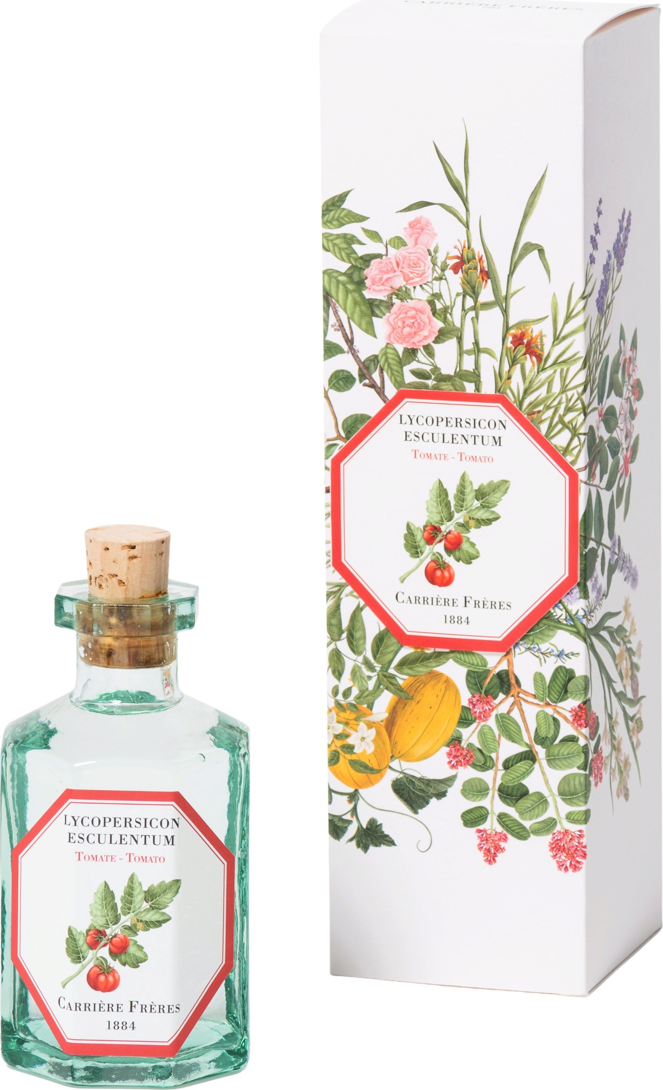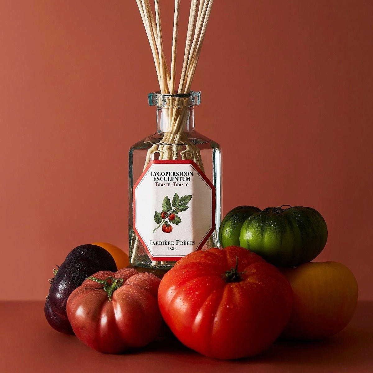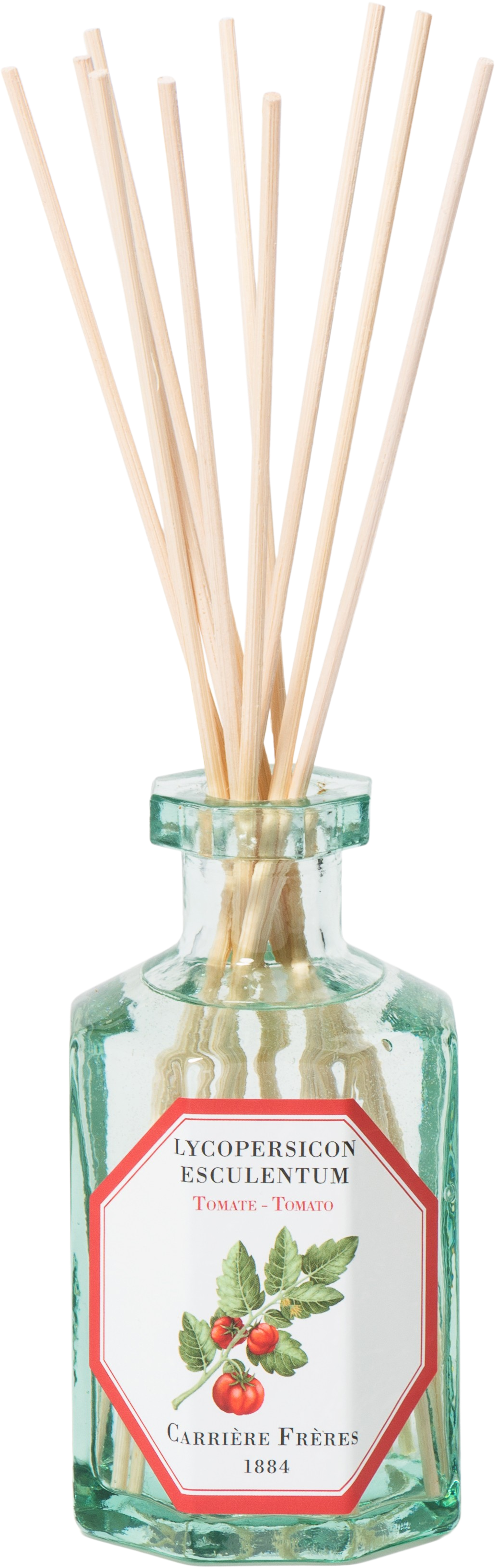 Дифузерът Tomato от Carrière Frère предлага растителен аромат, който е както пикантен, така и сладък, приканващ към наслада. Зелените нотки ви пренасят сред полета и напомнят на аромата на доматени листа. Вкусният аромат може да се наслаждава през цялата година и допринася за пречистен въздух в помещението.