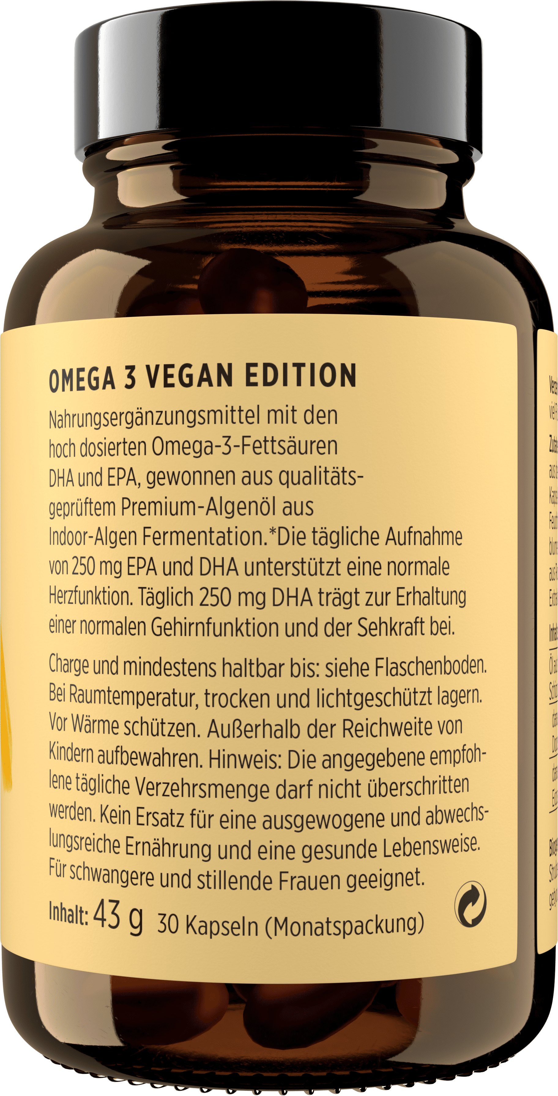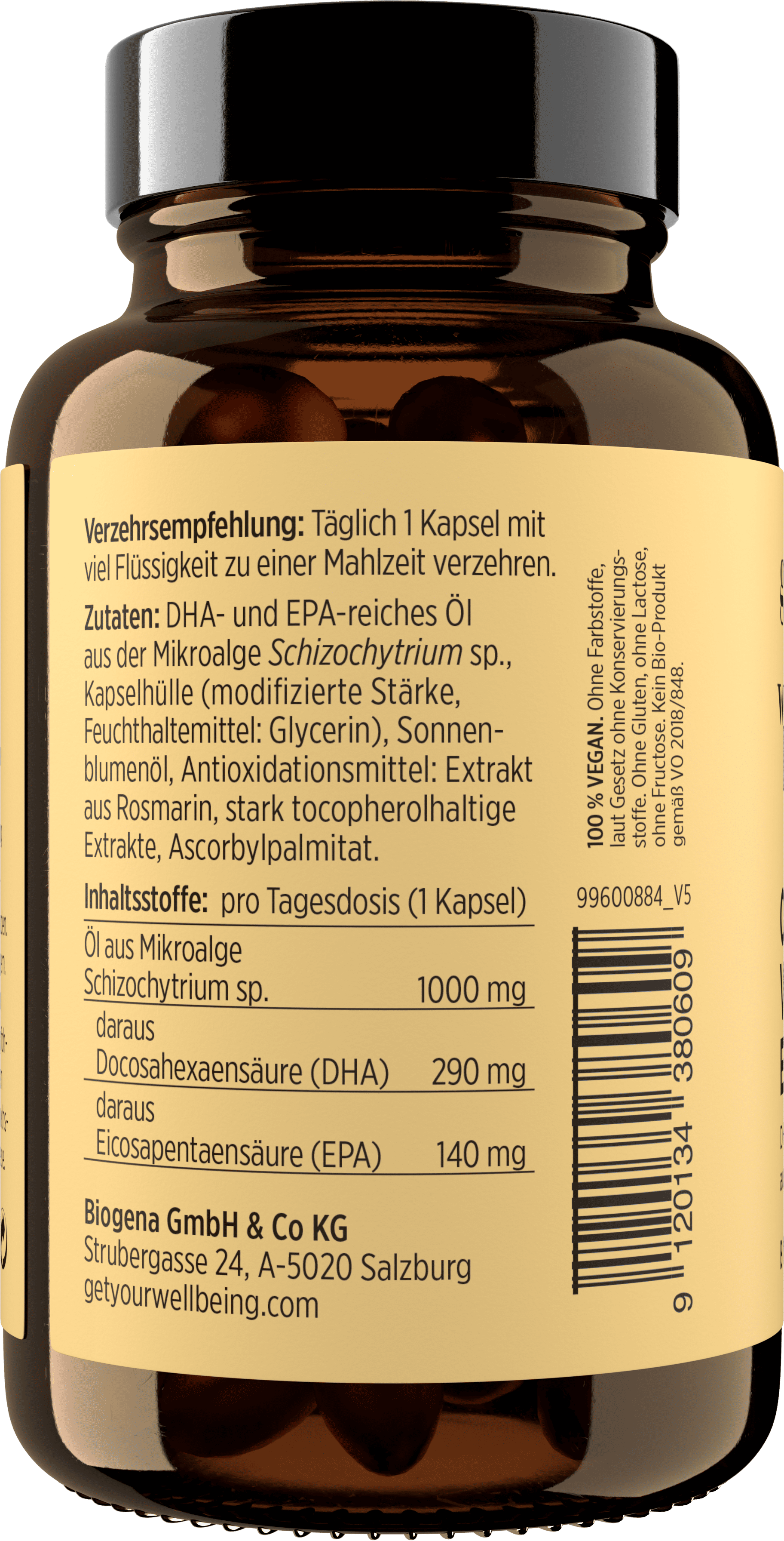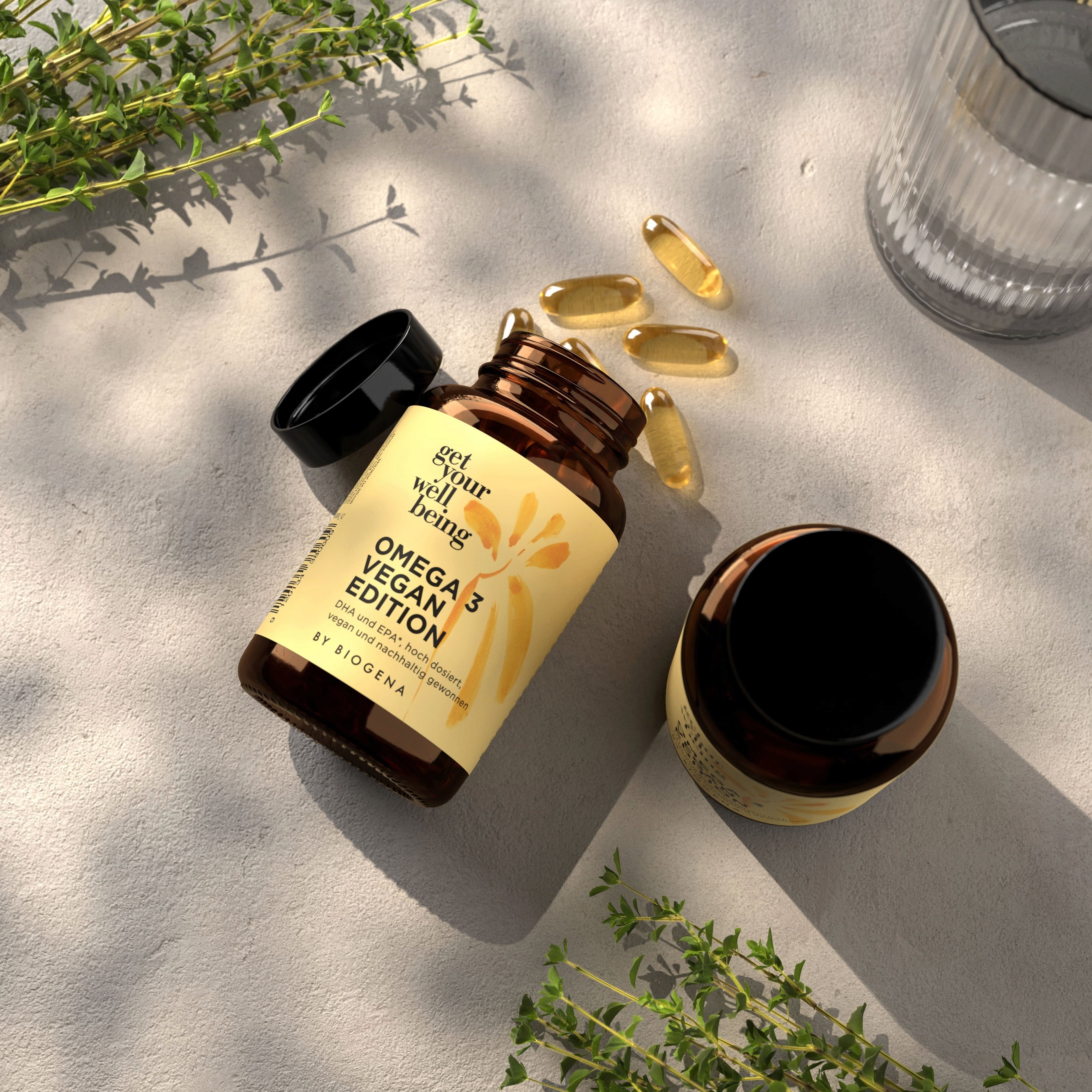 Omega 3 Vegan Edition от get your wellbeing by BIOGENA подпомага вашите когнитивни функции и ви помага да се справяте по-добре със стреса. Формулата съдържа висококачествено, веганско алгенно масло, богато на DHA и EPA.