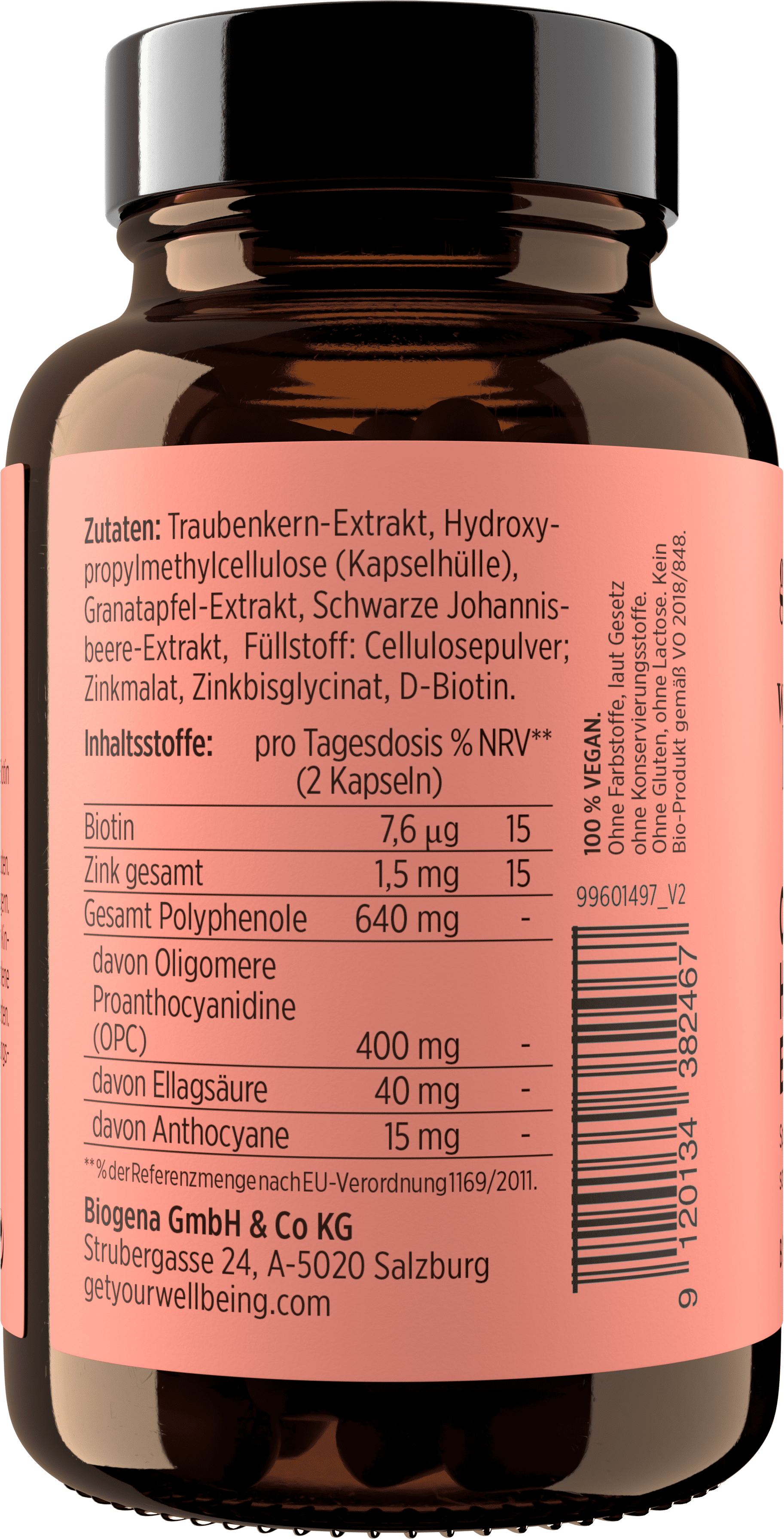 Traubenkern-Extrakt, Hydroxypropylmethylcellulose (Kapselhülle), Екстракт от нар, Schwarze Johannisbeeren Extrakt, Cellulosepulver, Zinkmalat, цинков бисглицинат, D-биотин