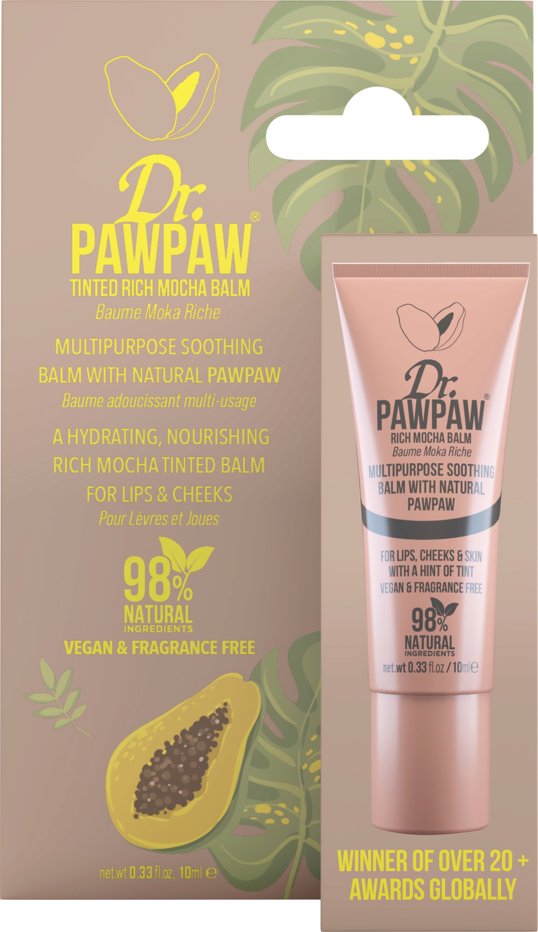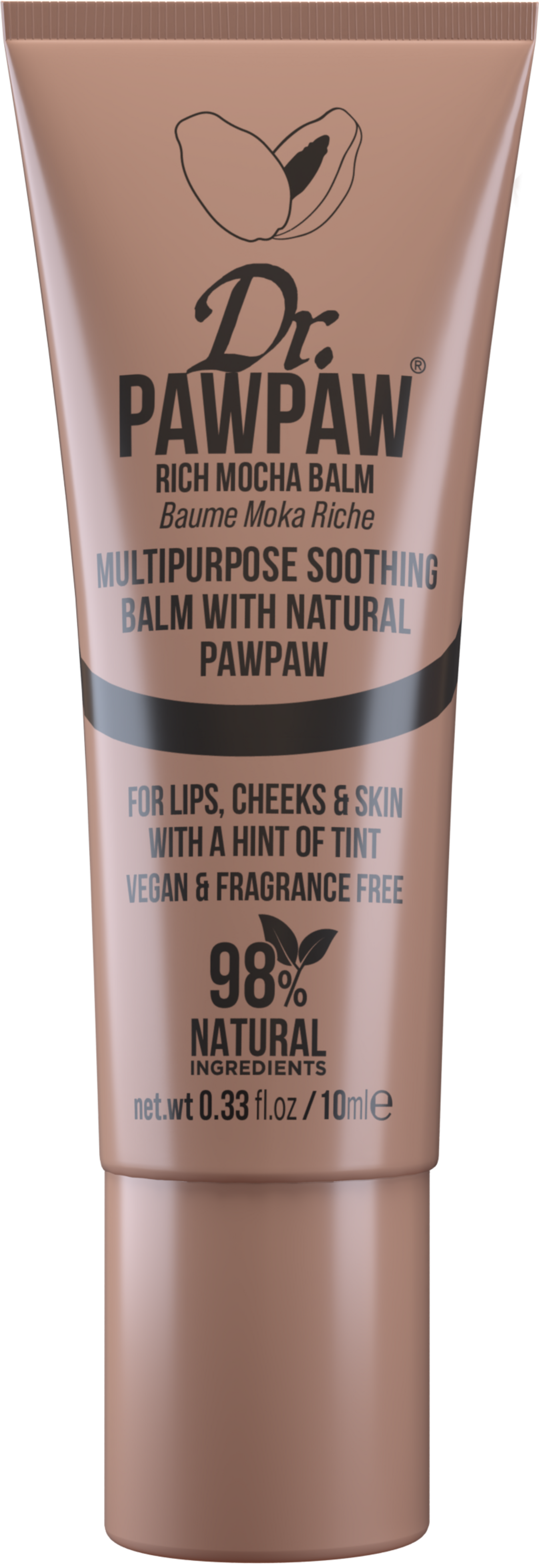 Оцветеният балсам за устни Rich Mocha от Dr. Pawpaw е многофункционален балсам за устни, бузи и клепачи. Оцветеният балсам е перфектно решение за грижа за устните и цвят. Формулата е обогатена с хидратиращи, защитни и подхранващи съставки като папая, алое вера и маслиново масло. Балсамът също така придава лек цвят на лицето ви. Осигурете на тена си мигновен блясък с наслояващия се цвят – идеален за визия от сутрин до вечер.