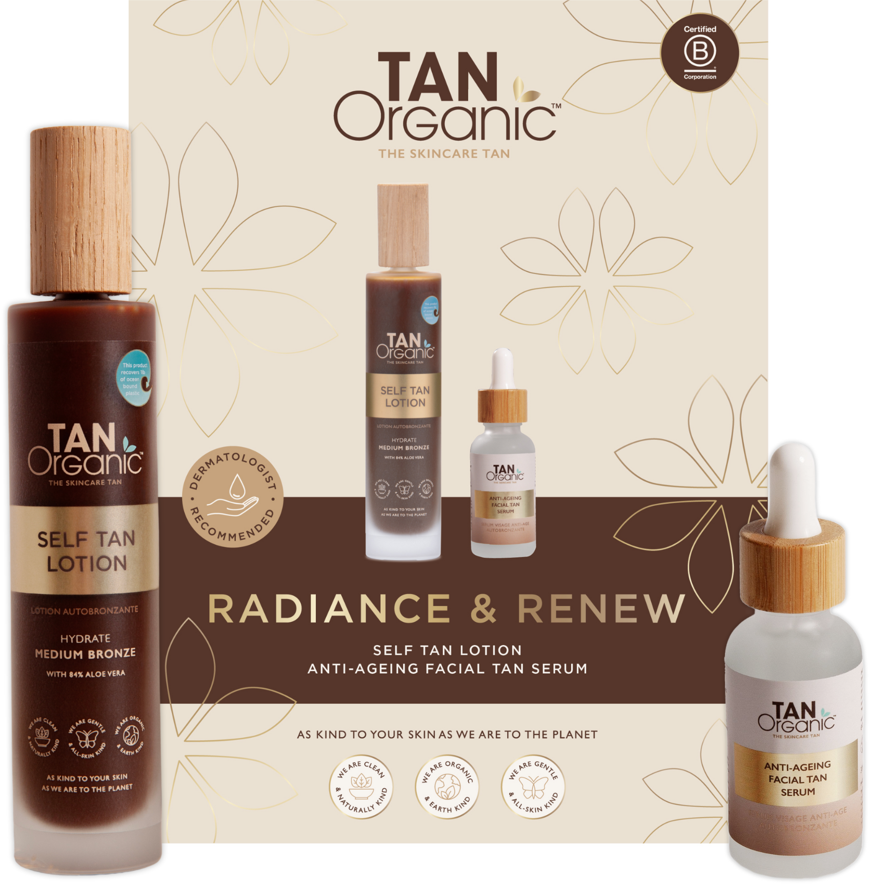 Подарете грижа за сияен тен с този дует! Лосионът за самозапалване осигурява безупречен, естествен тен с дълготрайно овлажняване, а серумът за лице против стареене разхубавява кожата с постепенен, целунат от слънцето блясък и укрепващи кожата свойства. Заедно те създават сияен завършек, който се усеща толкова добре, колкото и изглежда - най-добрата рутинна грижа за себе си!