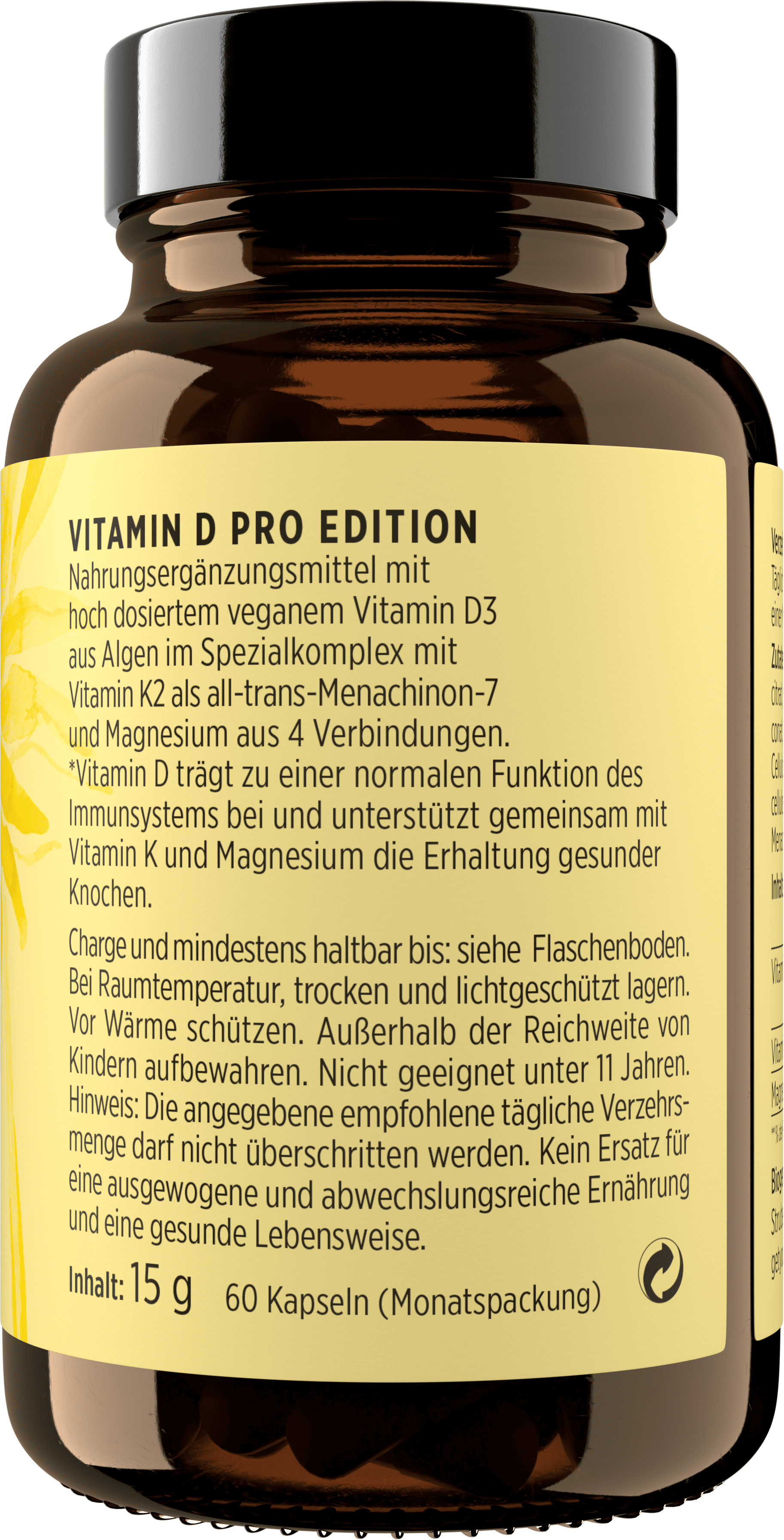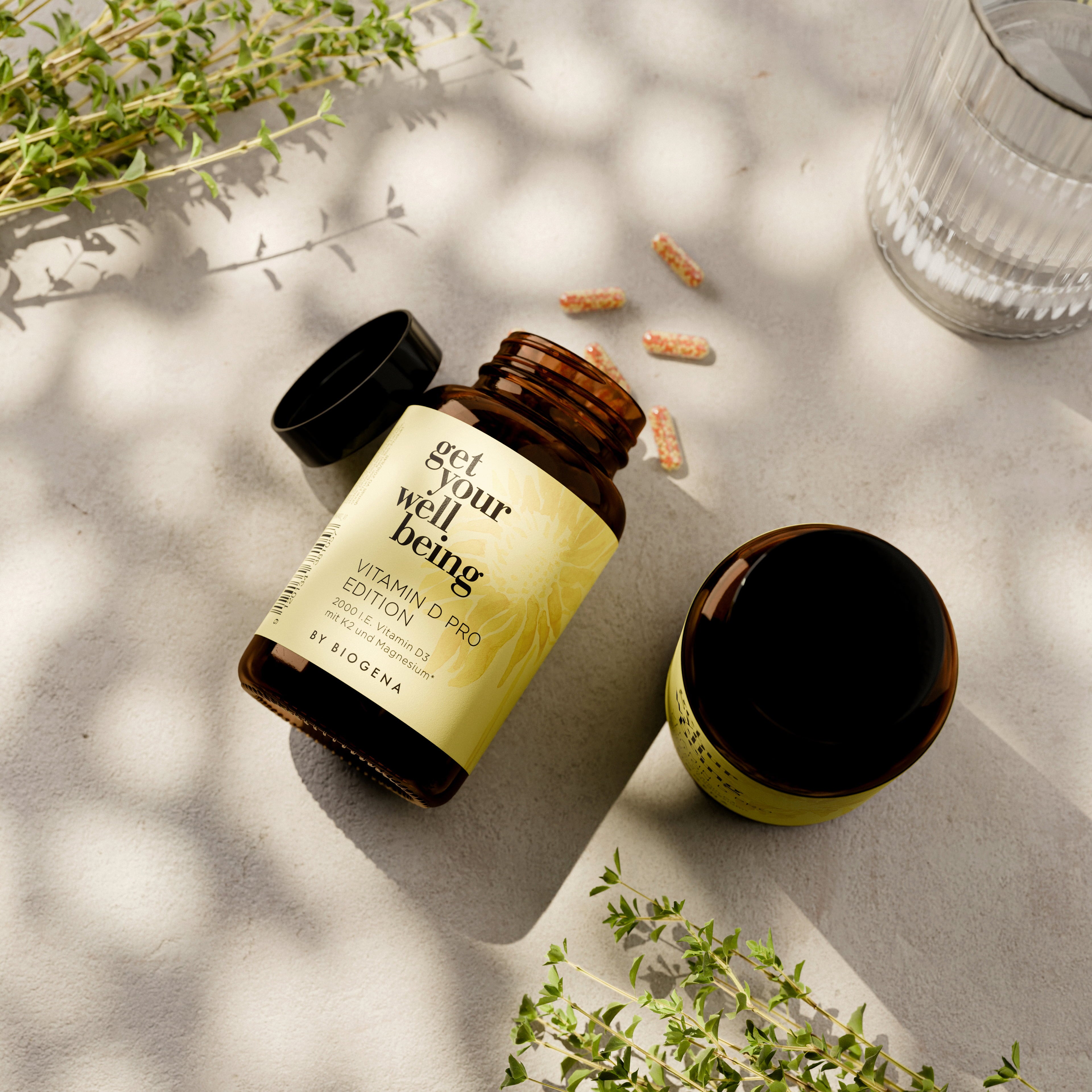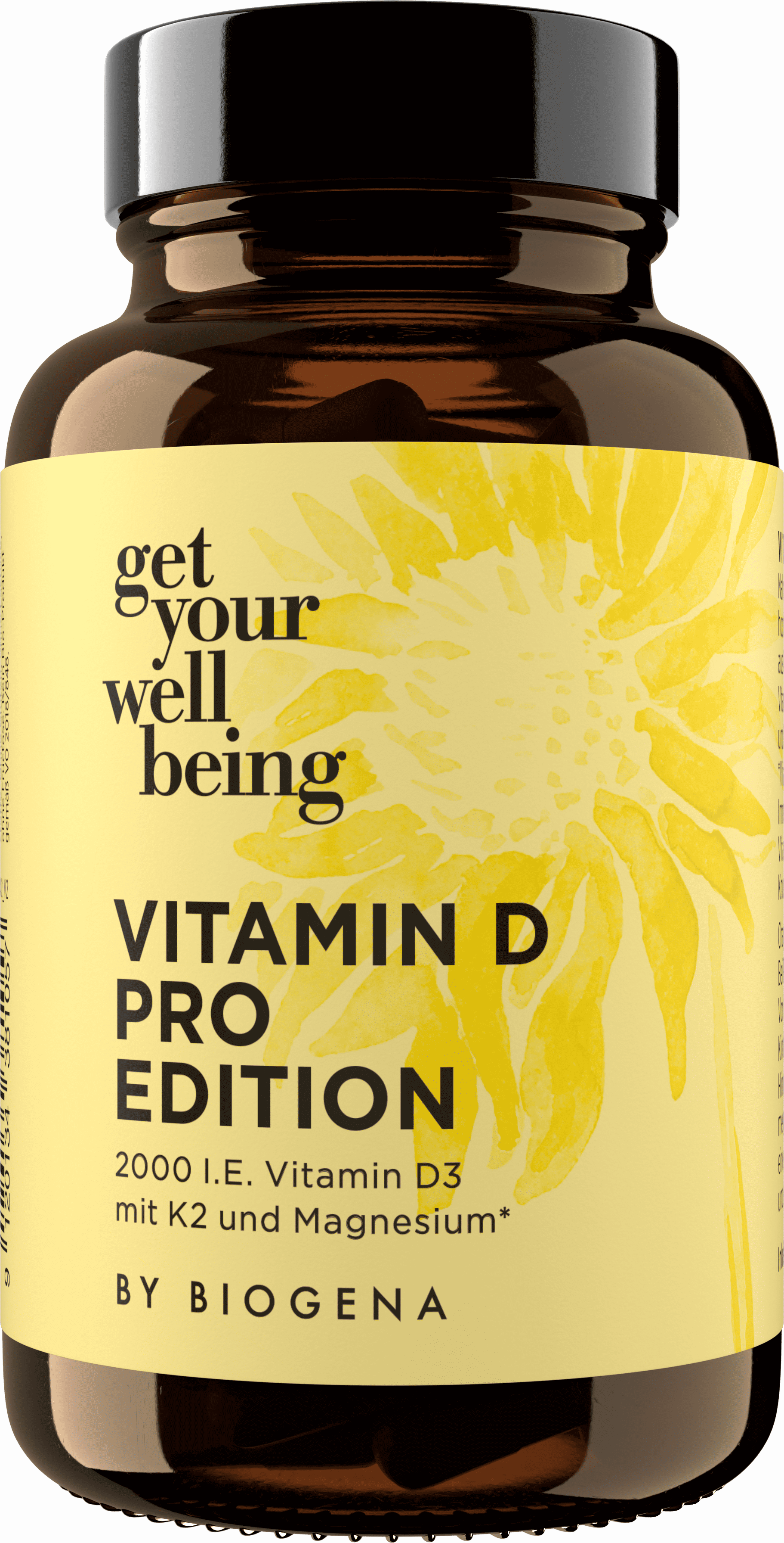 Vitamin D Pro Edition от get your wellbeing by BIOGENA подкрепя с вегански, високо дозиран витамин D3 от водорасли, известен също като витамин на слънцето. Специалният комплекс съдържа също магнезий от 4 съединения и витамин K2, който действа като all-trans-менахинон-7. Идеален за хора, които търсят целенасочена моно-препарация на витамин D и искат да използват синергичните му предимства.