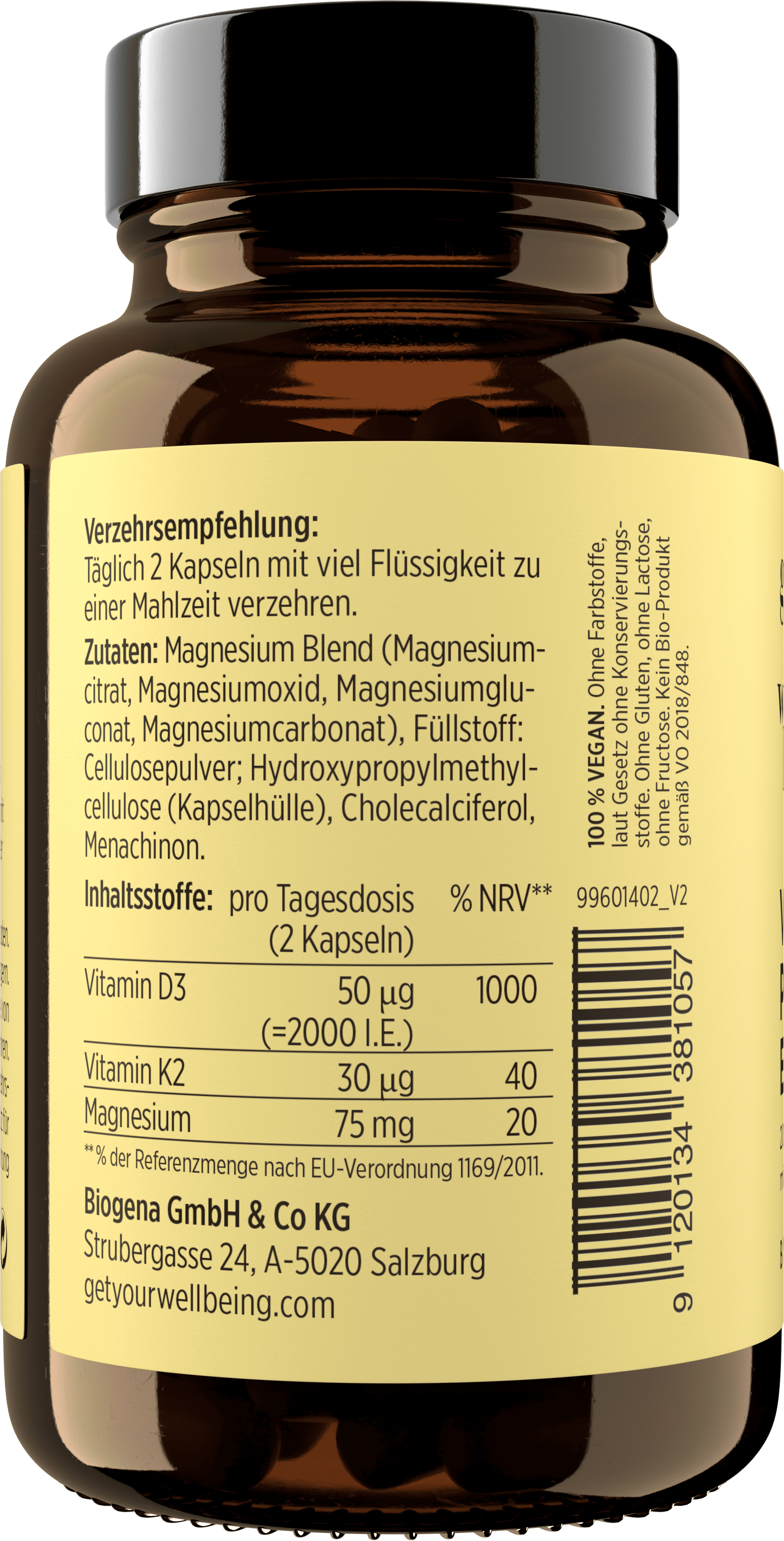 магнезиева смес (магнезиев цитрат, Magnesium (als Oxid), Magnesiumgluconat, Magnesiumcarbonat), агент за зареждане (Целулоза), Hydroxypropylmethylcellulose (Kapselhülle), холекалциферол (витамин D3), Menachinon