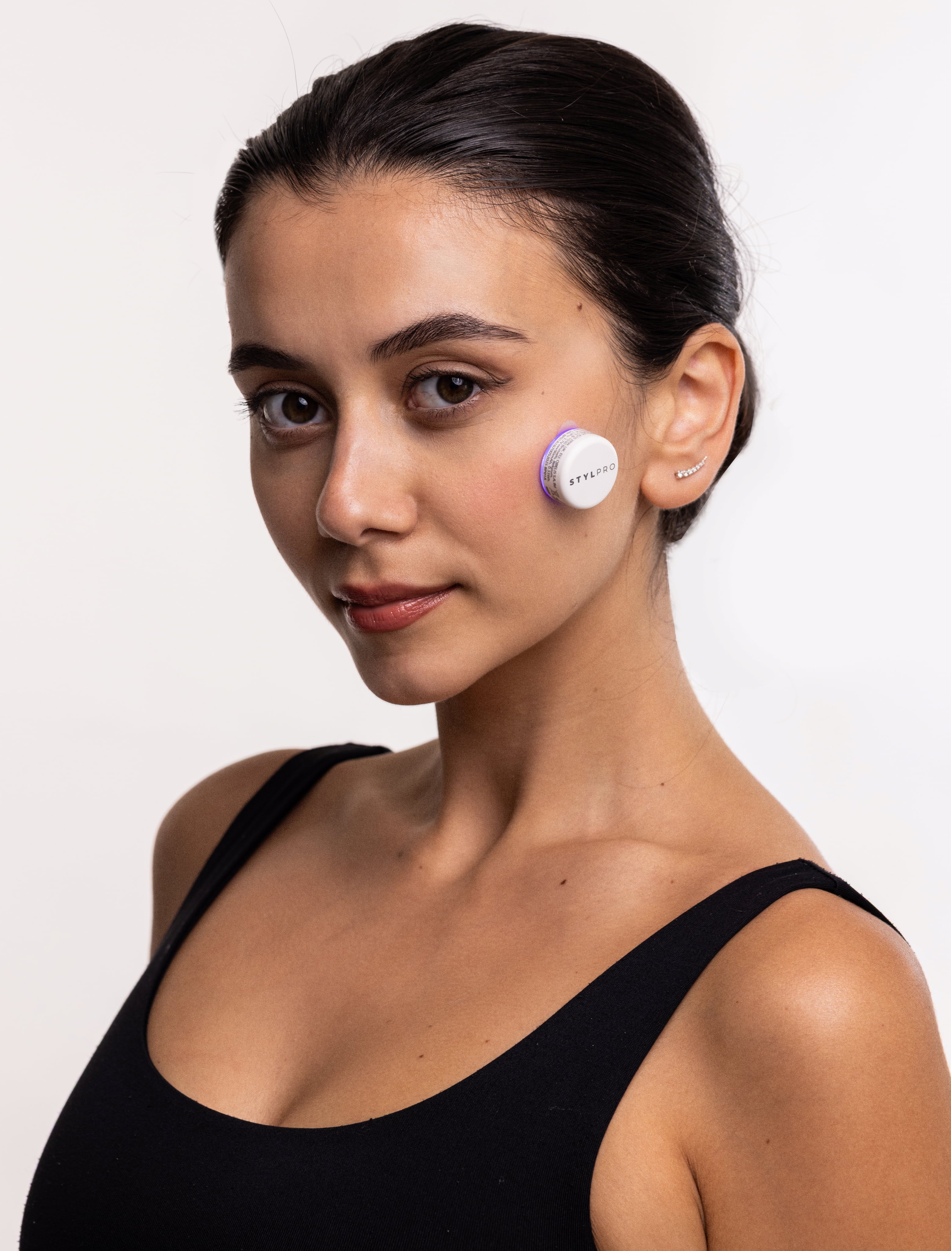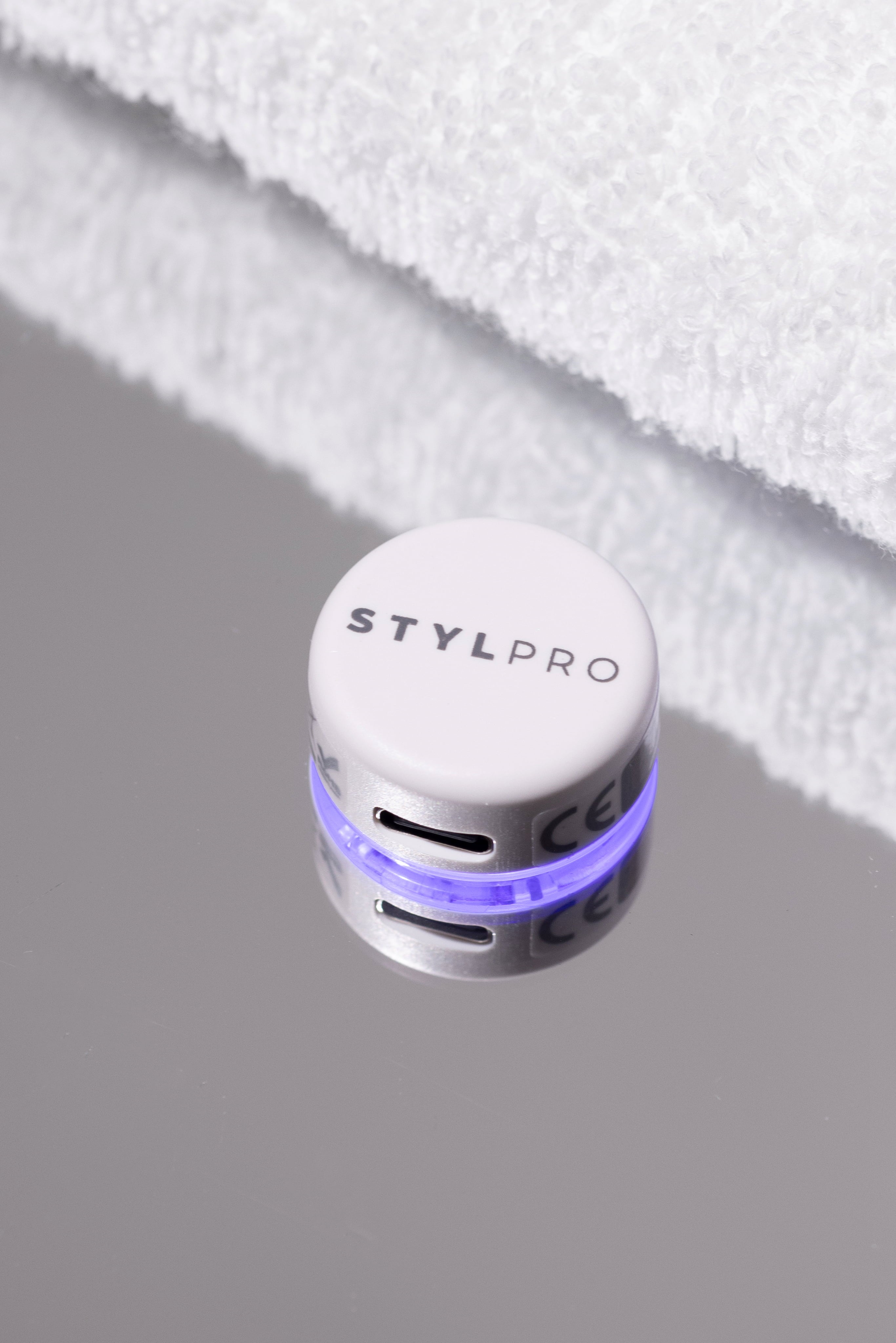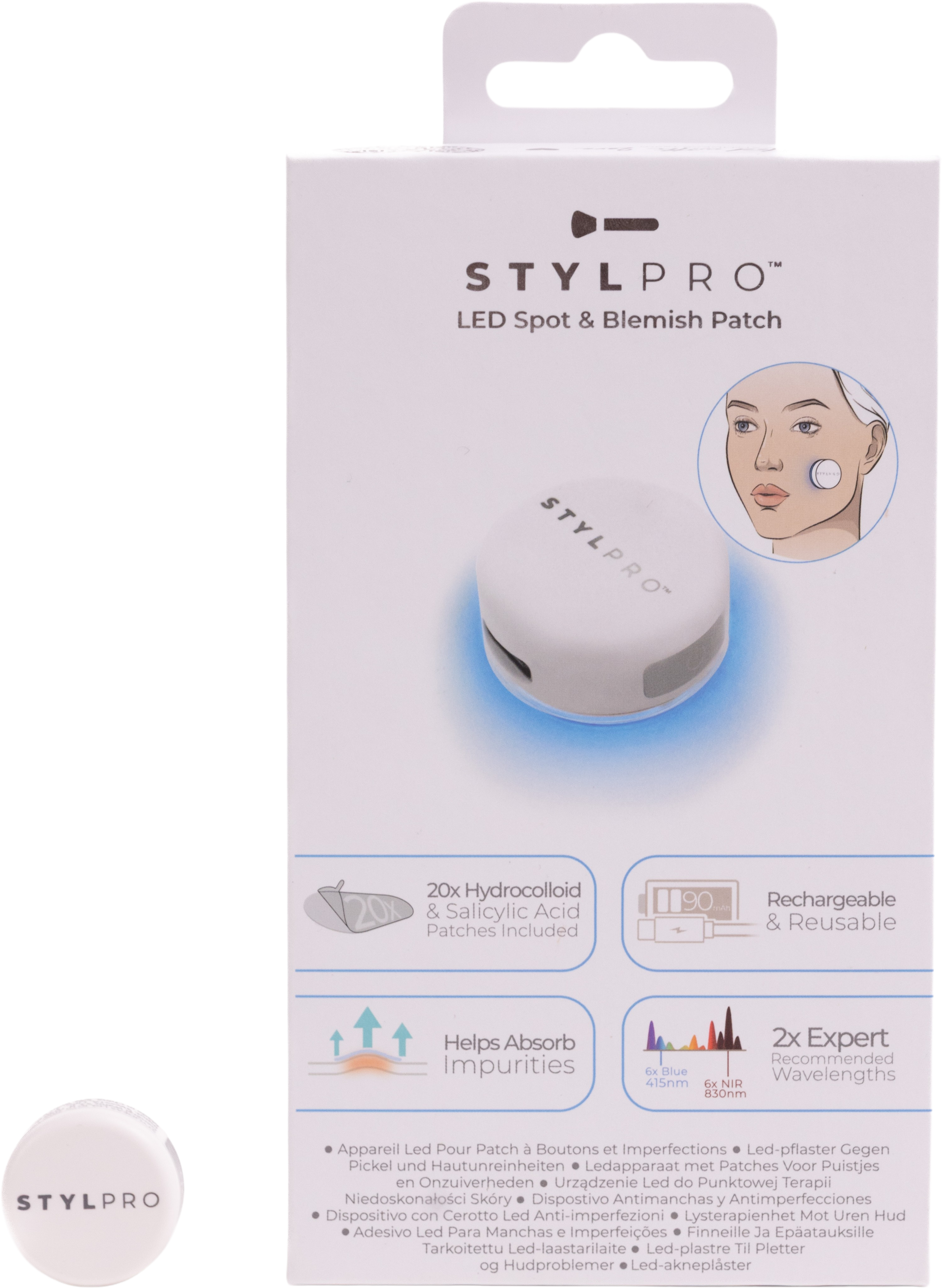 LED Spot & Blemish Patch от StylPro е презареждащ се уред за грижа за кожата, който комбинира целенасочена светлинна терапия с хидроколоидни и салицилови лепенки, за да ви осигури по-чиста и гладка на външен вид кожа. LED устройството разполага с шест сини (415 nm) и шест NIR (830 nm) диода. Лепенките помагат за абсорбирането на несъвършенства или замърсявания и леко ексфолират кожата. Инструментът е особено подходящ за хора с кожа, предразположена към несъвършенства, изключително лесен за употреба и подходящ както за домашно ползване, така и за пътуване.