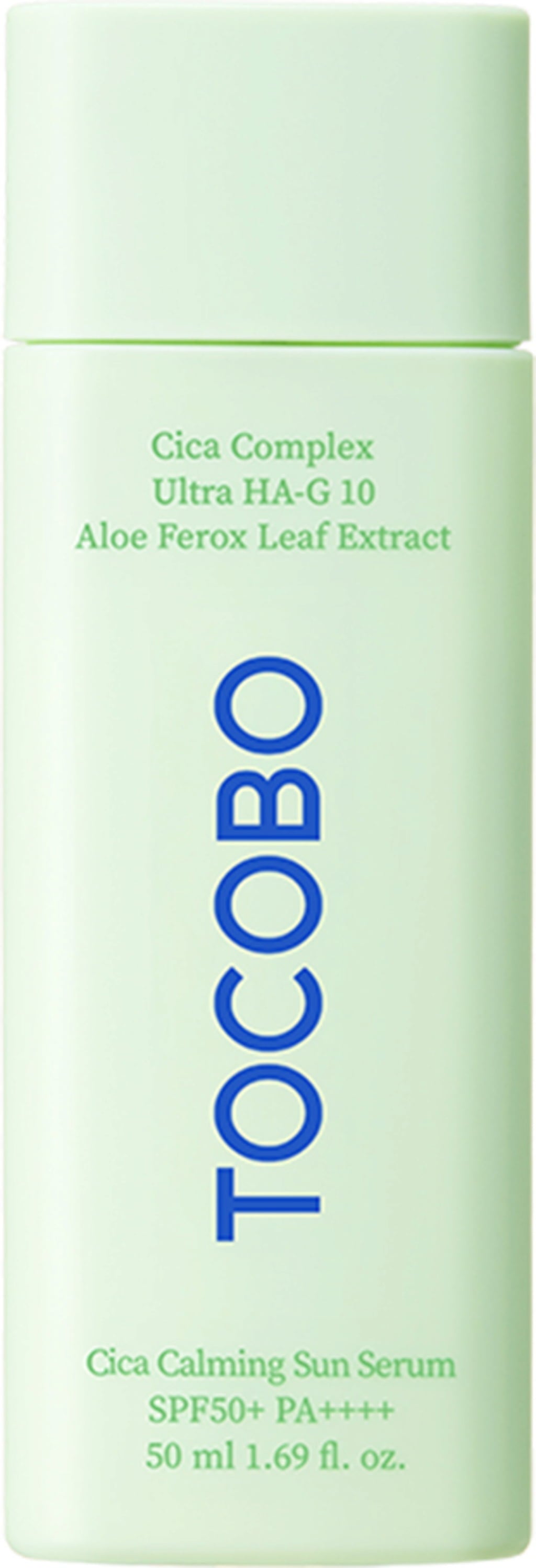 Cica Calming Serum SPF 50+ PA++++ от TOCOBO е новаторска форма на слънцезащита под формата на некомедогенно, веган серум. Формулиран е с ферментирала растителна Cica, осем различни типа хиалуронова киселина и чаено дърво, за да не само защитава от слънчеви лъчи, но и да успокои бързо слънчево раздразнената кожа. В горещите летни дни, серумът може също така ефективно да понижи температурата на кожата в рамките на секунди и да я охлади. За това се разчита на мулти-хиалуронов комплекс, който осигурява дълготрайна и дълбока хидратация. Допълнителни активни съставки като ниацинамид, Centella Asiatica и Aloe Ferox допринасят за интензивен подхранващ ефект. Те осигуряват на кожата хранителни вещества, минерали и есенциални аминокиселини, като същевременно предлагат и анти-ейдж свойства.
