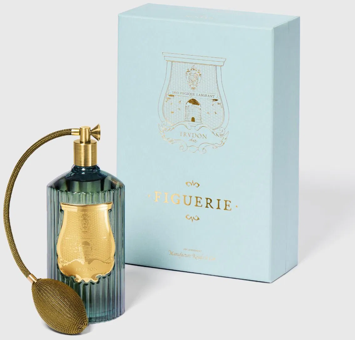 Room Spray Figuerie от Trudon е ръчно изработен в Тоскана от емблематично зелено стъкло и е украсен със златна емблема и традиционен пискюл. Спреят моментално създава ароматна атмосфера у дома и може да се използва не само във въздуха, но и върху тъкани, пердета, килими и покривала.