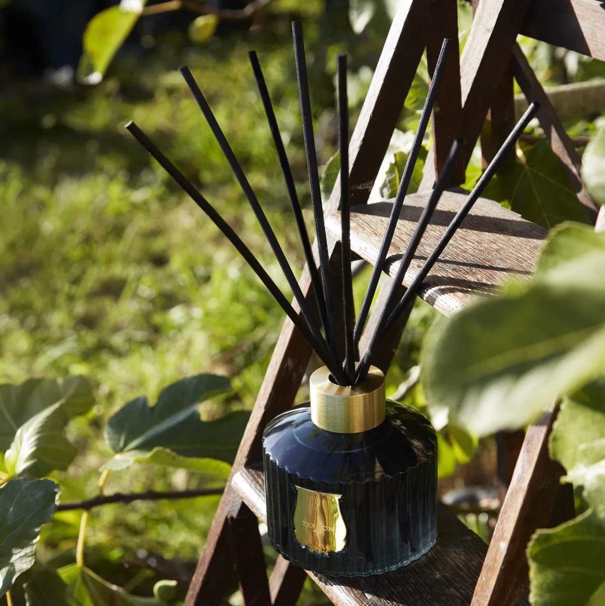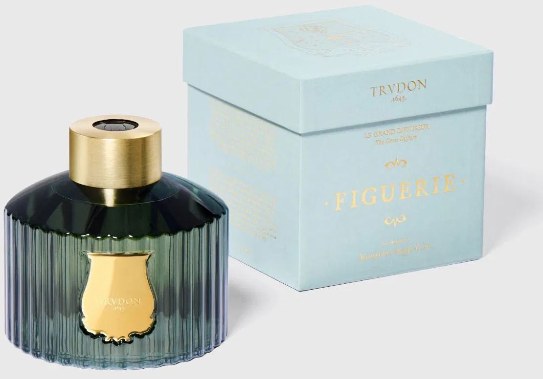 The Diffuser Figuerie от Trudon е изработен от емблематично зелено стъкло и е украсен със златна емблема. Дифузерът се изработва ръчно в мануфактурата на Trudon във Франция и е завършен с алуминиев пръстен. През него се поставят 8 черни, естествени ратанови пръчици, които разпределят аромата равномерно в помещението.