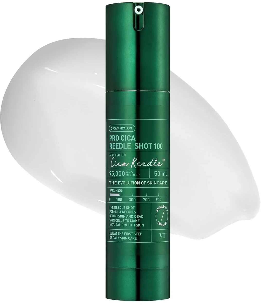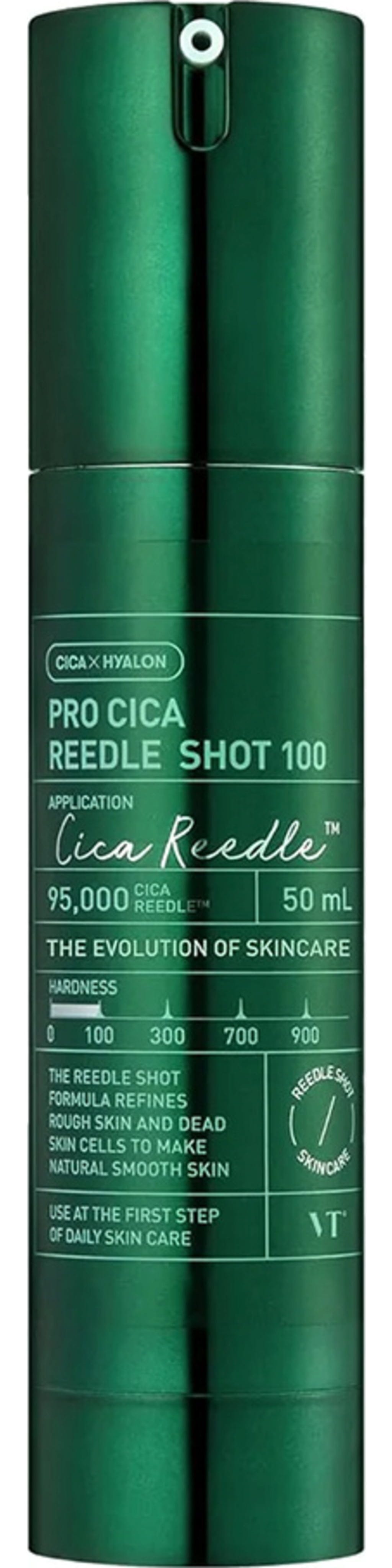 Pro Cica Reedle Shot 100 от VT Cosmetics е успокояващ серум с микронйдлинг-подобна технология, създаден специално за чувствителна и стресирана кожа. Той усъвършенства текстурата, осигурява интензивна хидратация и едновременно укрепва кожната бариера. В основата на формулата стои патентованият Cica Reedle™, който нежно „освобождава“ мъртвите клетки и остатъци и подготвя кожата оптимално за усвояване на следващи активни съставки. Формулата е допълнена с CICA екзозомни деривати, чиито изключително малки частици подобряват проникването в горните слоеве на кожата и повишават ефективността. В комбинация с доказания комплекс Cicahyalon™ кожата получава интензивна хидратация – идеално за чувствителна кожа, която лесно излиза от баланс.