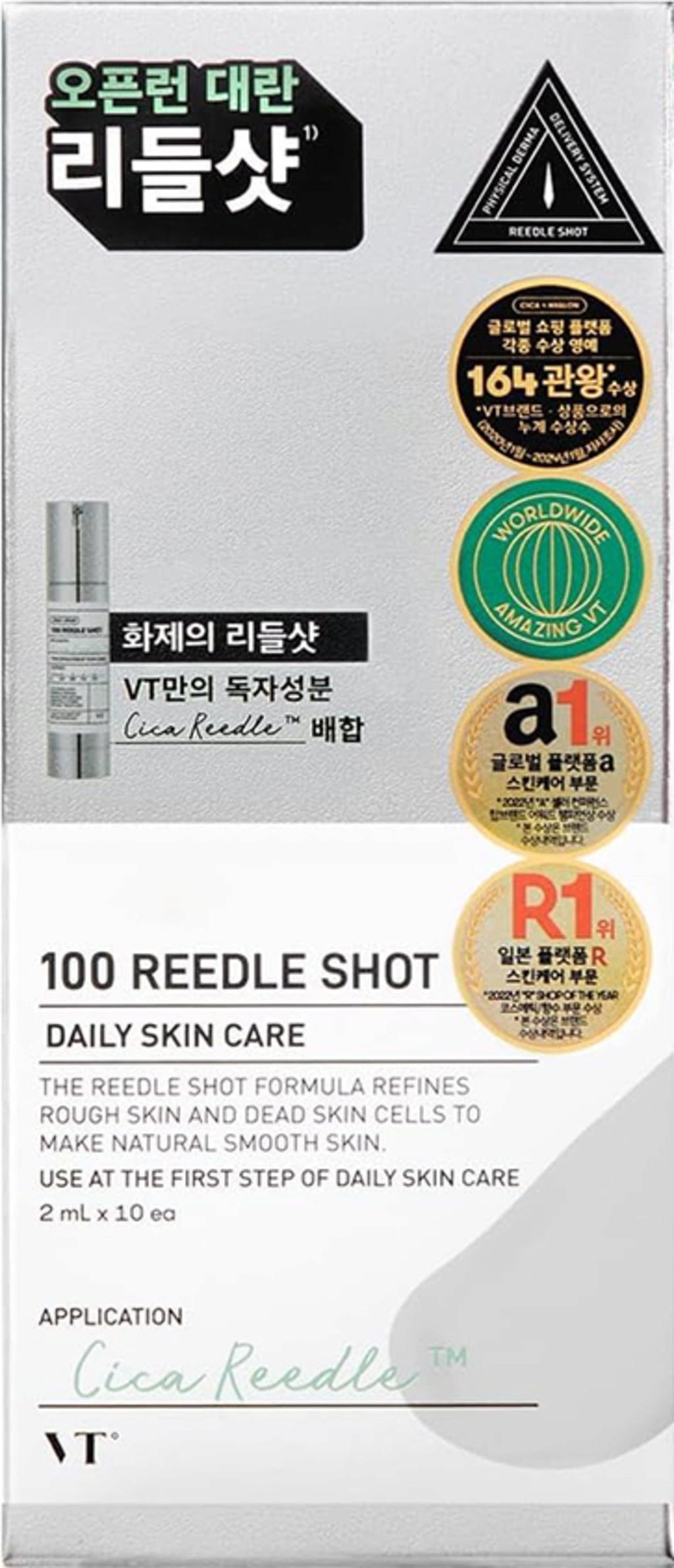 Reedle Shot 100 от VT Cosmetics е перфектен за съвсем първата стъпка – „Zero Step“ – във вашата ежедневна рутина, за да се доближите до популярния glass skin ефект. Той подпомага естествения процес на обновяване на кожата, премахва мъртвите клетки и насърчава нежното отстраняване на натрупани с времето несъвършенства. Така кожната текстура се изглажда и усъвършенства, а дори тъмни петна от пигментация или следи от пъпки видимо се озаряват. Формулата разчита на микронйдлинг-подобния Cica Reedle™, който е изграден от микроскопични минерални частици. Той подпомага и по-доброто усвояване на последващите ви продукти. С Cica екстракт и нискомолекулярна хиалуронова киселина, хипоалергенният, некомедогенен Reedle Shot 100 осигурява успокояваща и хидратираща грижа и е подходящ за всички типове кожа, включително чувствителна.