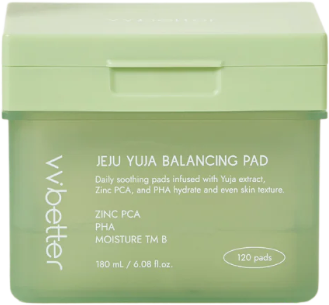 Тампоните Jeju Yuja Balancing Pads от vvbetter са хидратиращи тампони за лице, които съдържат висока концентрация на екстракт от Jeju-Yuja. Jeju-Yuja е известен с високото си съдържание на витамин С. Освен това, тампоните съдържат PHA киселини и цинк-PCA, което спомага за освобождаването на кожата от мъртви кожни клетки и регулирането на производството на себум. Centella Asiatica, известна и като Индийска водна пъпка, се грижи за кожата.