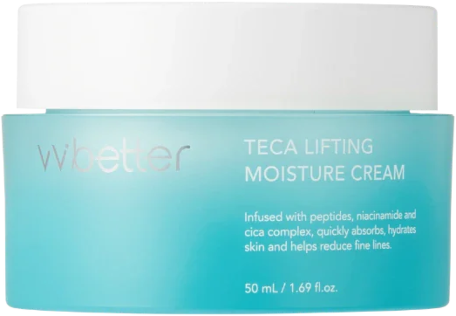 Teca Lifting Moisture Cream от vvbetter е хидратиращ крем за лице с Centella Asiatica и TECA-КОМПЛЕКС - комбинация от азиатска киселина, азиатикозид и мадекасовна киселина, разработена от фармацевти за усилване на активните свойства на Centella Asiatica. Допълнително, комплекс от 9 пептида, аденозин, хиалуронова киселина и ниацинамид се грижи за кожата в дълбочина. Сухата кожа е интензивно наситена с ценна влага, а чувствителната кожа бързо придобива приятно усещане. Регенирацията на кожата се подкрепя и тя изглежда по-свежа и сияйна.