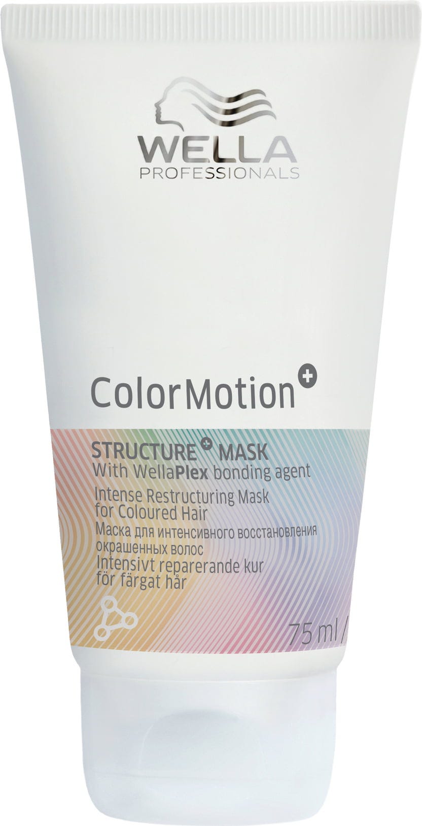 ColorMotion+ Structure+ Mask е седмичната програма за грижа за боядисана коса, която отива далеч отвъд обичайната защита на цвета. Само след едно нанасяне ще усетите как иновативната формула дълбоко регенерира косата ви и ѝ придава ненадминат блясък. Благодарение на вградения укрепващ елемент за структурата WellaPlex вътрешните връзки на влакната на косата ви са подсилени, а полиращият елемент за повърхността на косъма изглажда кутикулата - за забележимо по-добро разресване и подсилен външен вид. Наслаждавайте се на жив, сияен цвят на косата до 8 седмици, защитен от свободните радикали чрез допълнителни антиоксиданти. В комбинация с шампоана ColorMotion+ и балсама ColorMotion+ на Wella Professionals създавате перфектната основа за коса, която не само блести, но и се чувства обновена от самото начало.