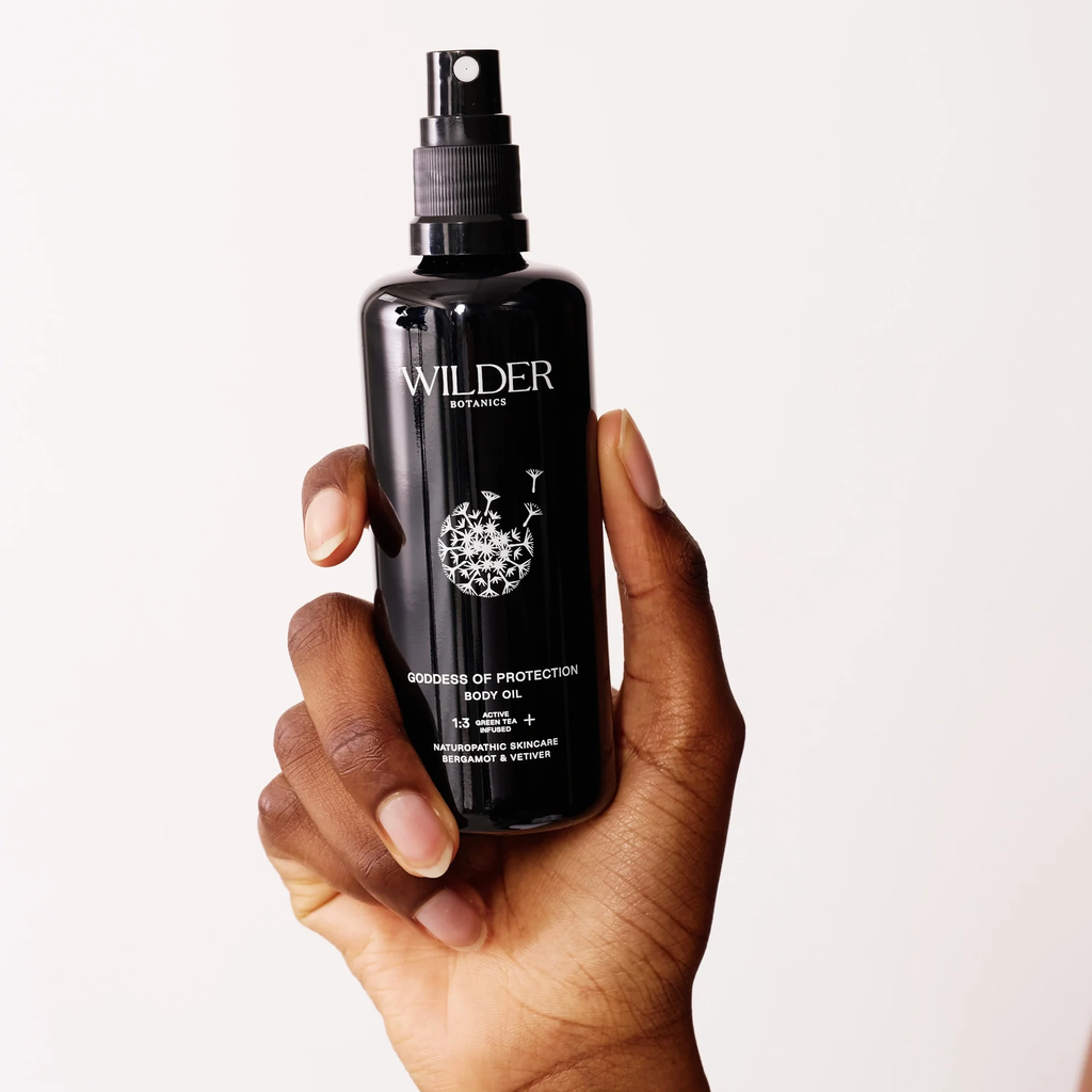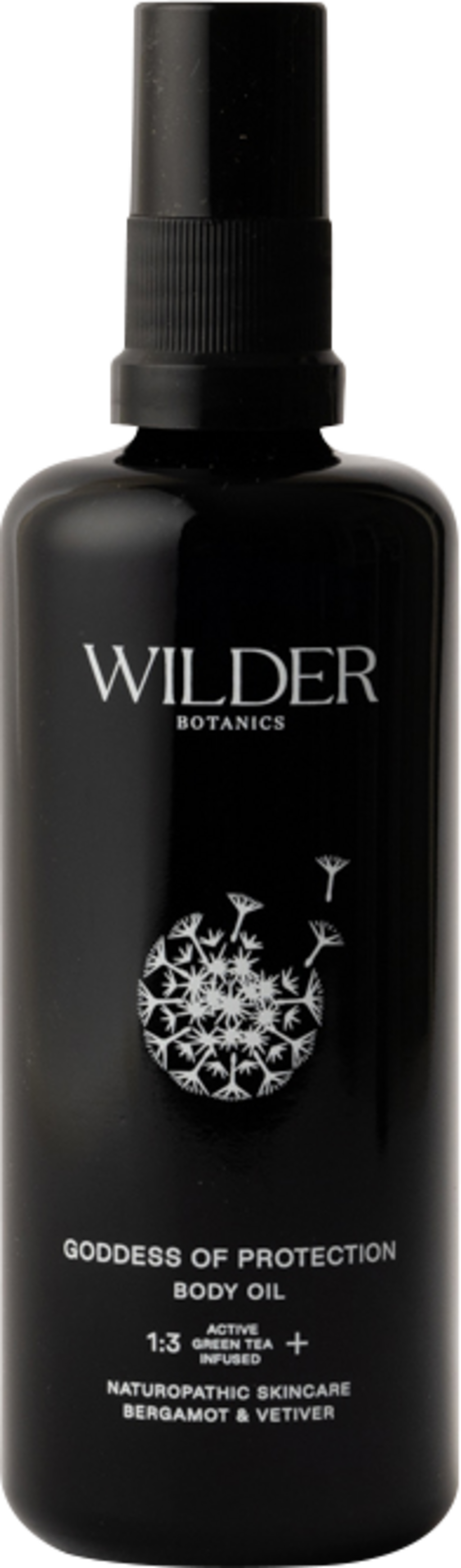 В Goddess Of Protection Body Oil от Wilder Botanics, златното гроздово масло се комбинира синергично с масло от облепиха и сенча-зелен чай, които осигуряват защита на кожата ви. Фината смес придава нова жизненост на кожата, особено когато е увредена от стрес от околната среда или слънце. Земните и ободряващи нотки на бергамот и ветивер дават нова сила не само на тялото, но и на духа.